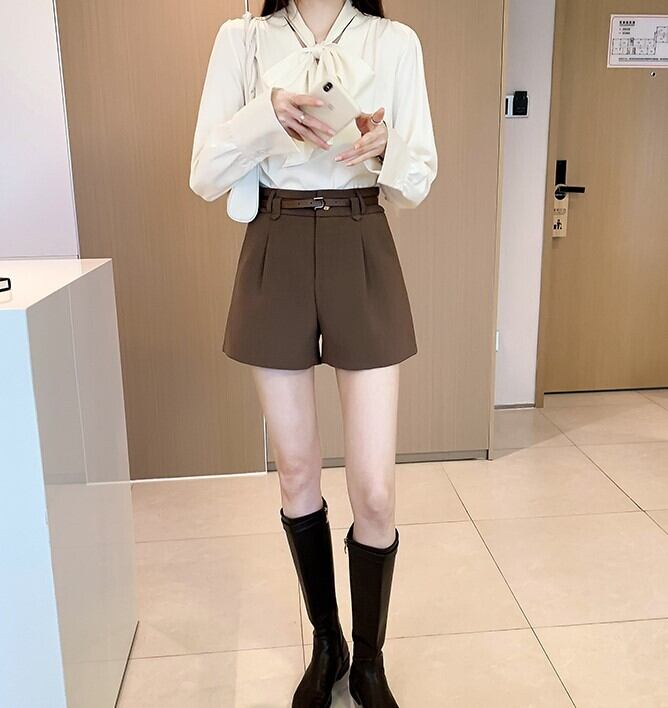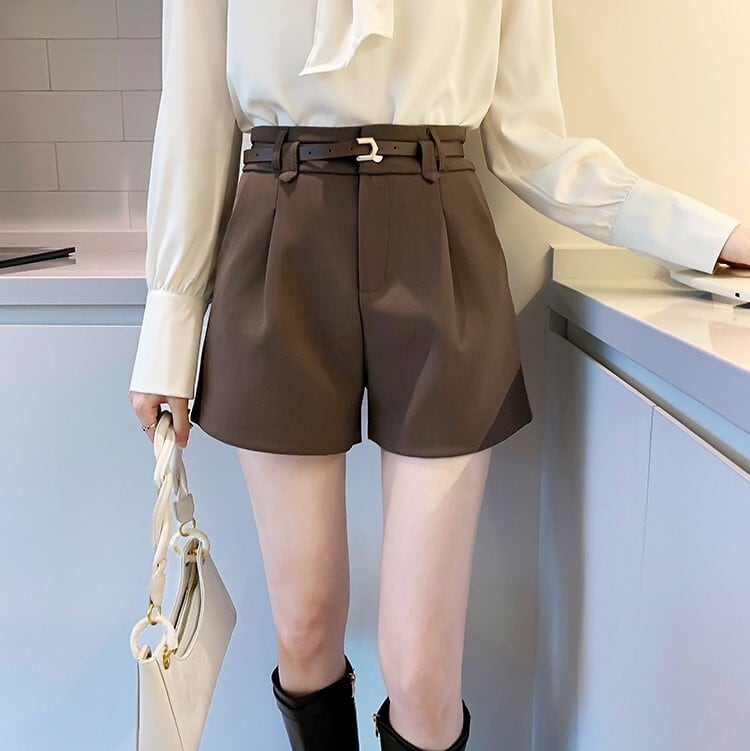 細ベルト付き フロントダブルベルトループ ワイドレッグパンツ レディース パンツ ボトムス ショートパンツ ミニ ショート 膝上 ワイド Aライン ベルト ウエストマーク ポケット ハイウエスト きれいめ シンプル カジュアル 上品 おしゃれ クール ベーシック 無地 春 夏 女の子 学生 学校 通学 デート お出かけ 旅行 女子会 休日 ショッピング ライブ カフェ 韓国 オルチャン コーデ 脚長 普段使い 着回し 定番 S M L XL 2XL 大きいサイズ 黒 ブラック 茶色 ブラウン 大人カラー