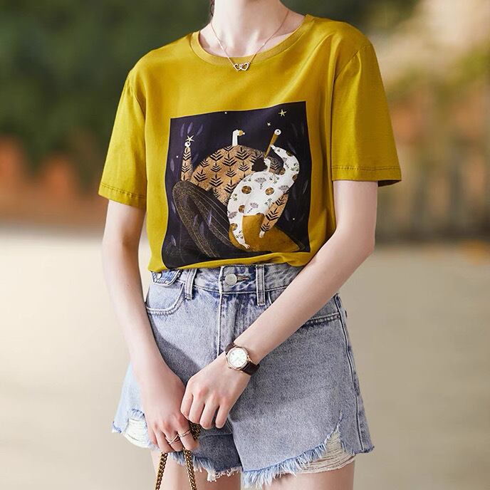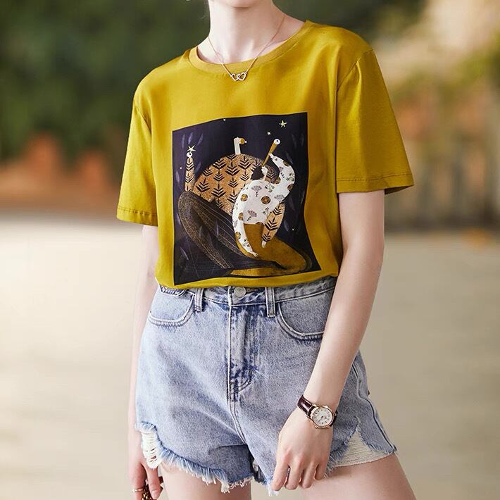 レディース トップス インナー Tシャツ 半袖 ラウンドネック スリム 細身 ストレート タックイン 薄手 きれいめ シンプル カジュアル 上品 おしゃれ かっこいい レトロ こなれ感 ラフ 個性的 エレガント モダン ヴィンテージ クラシカル 花柄 フラワー プリント アニマル柄 アート 植物 春 夏 母の日 ママ お出かけ リゾート 旅行 海 プール ビーチ 休日 ショッピング カフェ 韓国 コーデ 楽ちん 普段使い 着回し インスタ映え SNS映え サイズ S M L XL イエロー マスタード