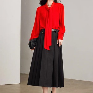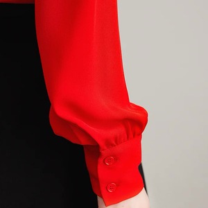 目を引くレッドの鮮やかな色合いが特徴のボウタイブラウス。