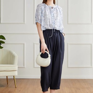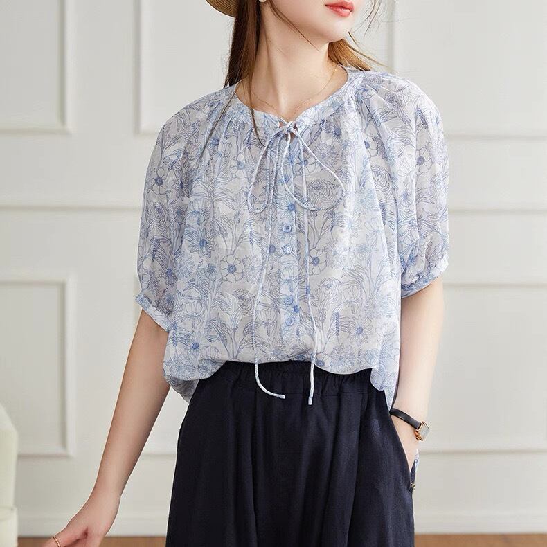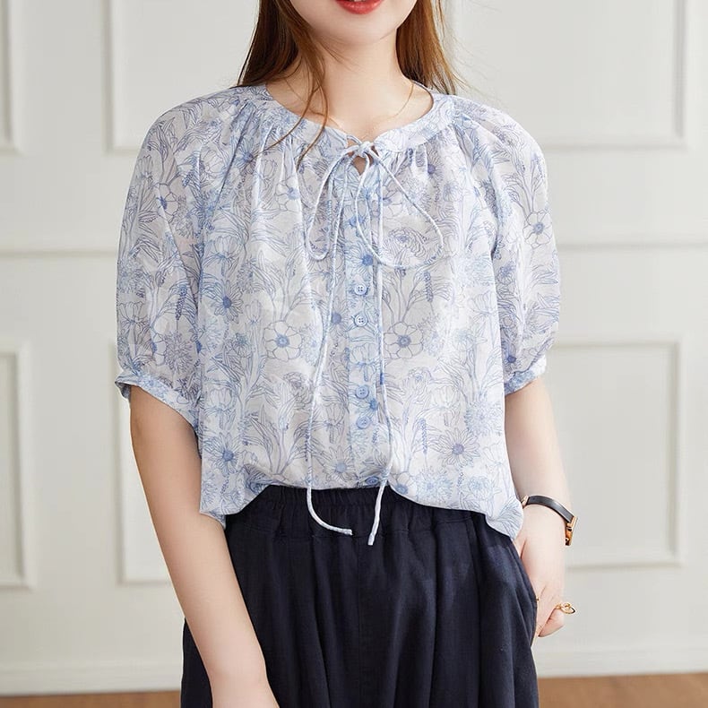 レディース トップス シャツ 前開き 半袖 プリーツパフ ドロップショルダー ラウンドネック フェミニン タック リボン ボタン 薄手 大人可愛い カジュアル 上品 おしゃれ ラフ ガーリー ルーズ エレガント キュート 爽やか 清涼感 涼し気 花柄 フラワー プリント 春 夏 母の日 授業参観 ママ 母 お母さん デート お出かけ リゾート 旅行 海 プール ビーチ 公園 女子会 休日 ショッピング お花見 韓国 コーデ 普段使い 着回し 清楚 サイズ展開 S M L XL ゆったり 水色 ブルー 青