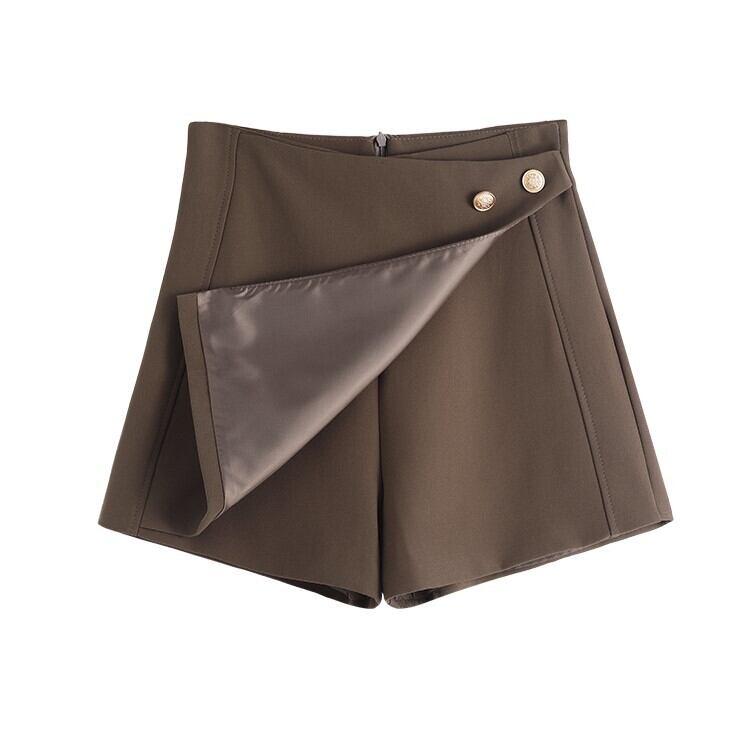 前部分のみ巻きスカート風のラップデザインになっている、サイドボタンがポイントのショートパンツです。着脱がラクなバックファスナー仕様のハイウエストデザインで脚長効果抜群。落ち付いたカラーでコーディネートするトップスの色柄を問わず、すっきりおしゃれに決まるアイテムです。着回し力抜群の優秀アイテムを是非お試しください。