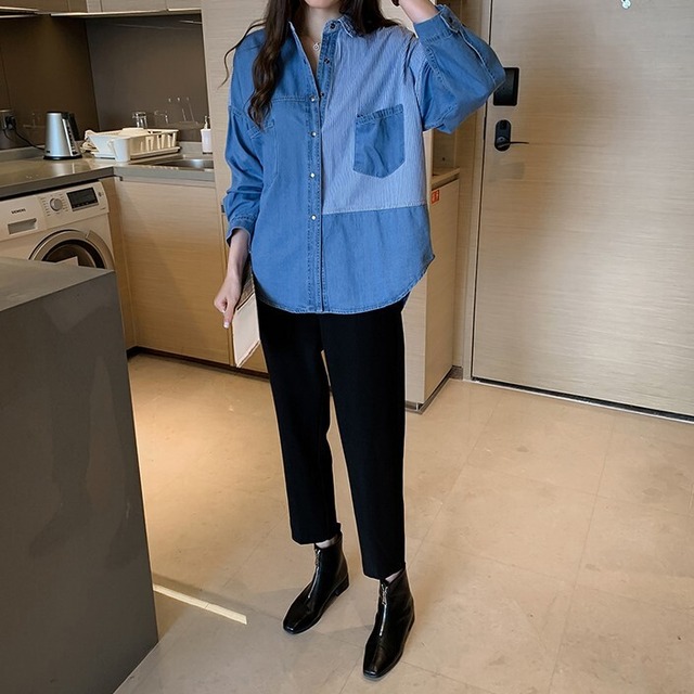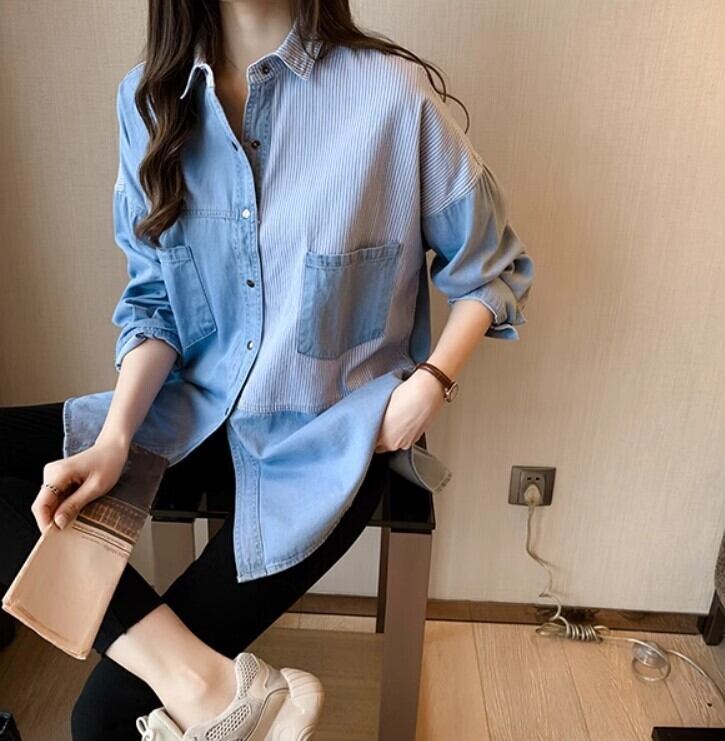 柄切替え アンバランスヘム デニムシャツ レディース トップス シャツ ブラウス 羽織り ミディアム丈 チュニック丈 長袖 ドロップショルダー 襟付き 角襟 オーバーサイズ ポケット 前開き ボタン 切り替えデザイン ブルーデニム かわいい 大人可愛い シンプル カジュアル 上品 おしゃれ こなれ感 個性的 カレッジ風 無地 ストライプ 春 秋 ママ 女の子 学生 学校 通学 デート お出かけ 旅行 公園 休日 ショッピング ライブ カフェ 体型カバー 普段使い S M L XL ゆったり ゆる ブルー