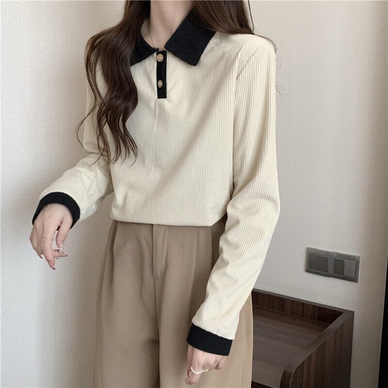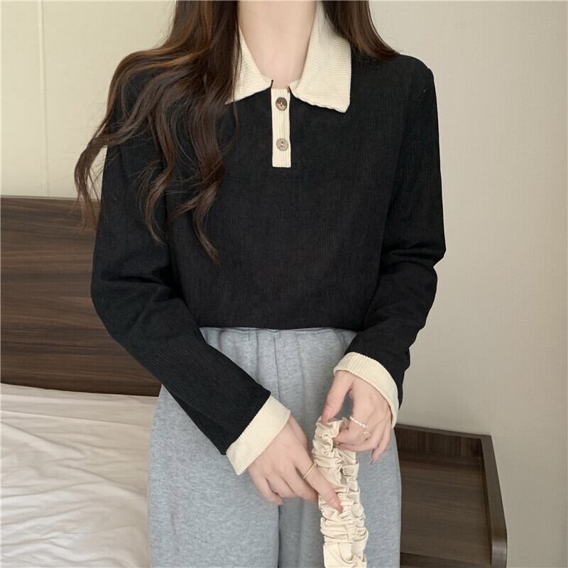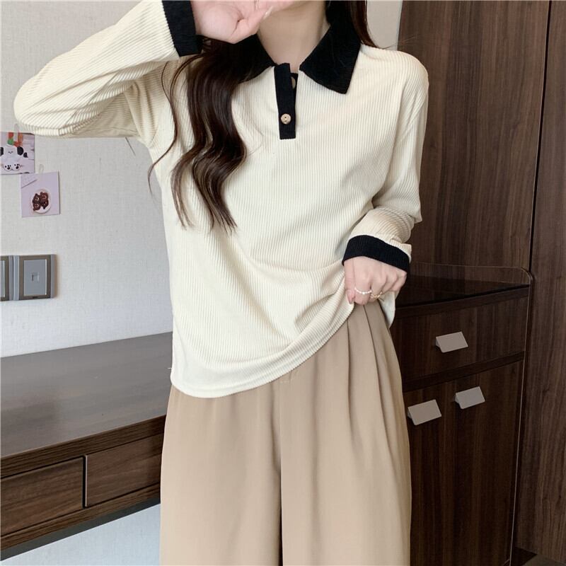 バイカラー 襟付き トップス レディース プルオーバー 丈長 長袖 角襟 ポロカラー リブ ボタン 配色 かわいい 大人可愛い シンプル カジュアル おしゃれ こなれ感 無地 春 秋 冬 ママ 通勤 学生 学校 通学 デート お出かけ 旅行 公園 女子会 休日 ショッピング カフェ 体型カバー 普段使い 着回し M L XL 2XL 大きいサイズ ゆったり 黒 ブラック カーキ アプリコット