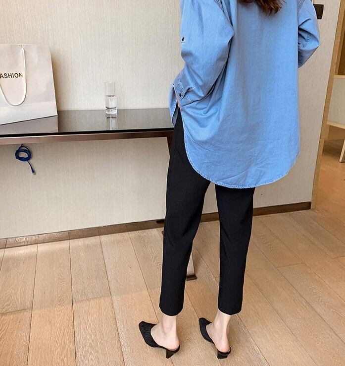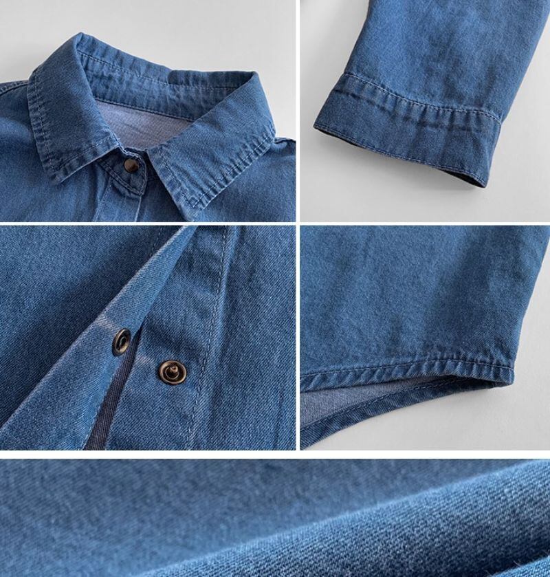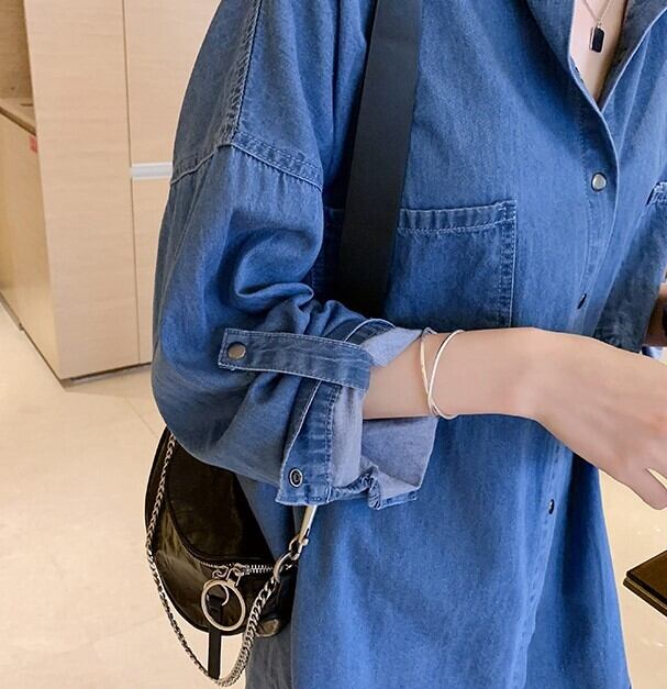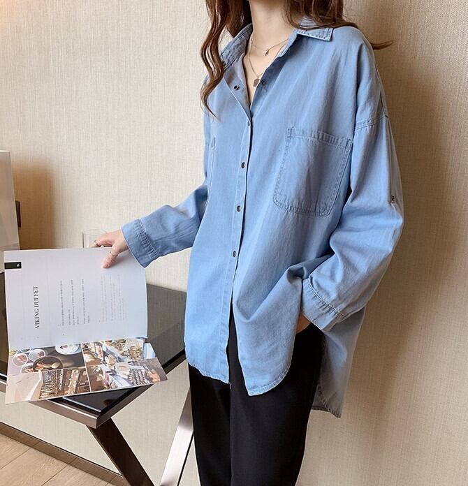 ゆるシルエット アンバランスヘム デニムシャツ トップス シャツ 羽織り ミディアム丈 チュニック丈 長袖 袖ロールアップベルト ドロップショルダー 襟付き 角襟 オーバーサイズ 前開き メタルスナップボタン ブルーデニム シンプル カジュアル 上品 おしゃれ こなれ感 リラクシー 無地 春 秋 ママ マタニティ 女の子 学生 学校 通学 お出かけ アウトドア キャンプ 旅行 公園 休日 重ね着 韓国 オルチャン コーデ 体型カバー 定番 普段使い 着回し レイヤード ゆったり ゆる フリーサイズ ブルー