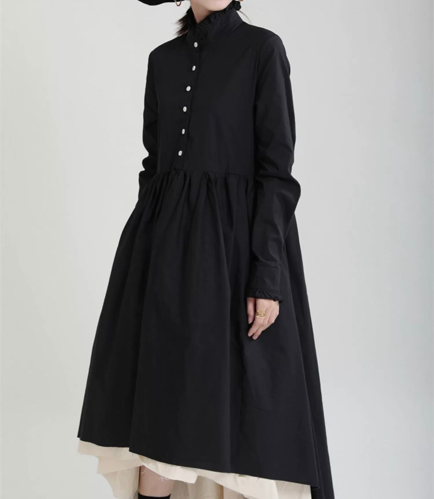 レディース ワンピース ロング丈 長袖 スタンドカラー Aラインスカート ボタン 無地 ハイウエスト スリム 細身 きれいめ 上品 おしゃれ お洒落 大人可愛い 大人女子 かっこいい クール モダン シック フェミニン 主役級 存在感 こなれ感 抜け感 春 秋 20代 30代 40代 お出かけ デート 女子会 休日 お泊まり 旅行 ショッピング レストラン ガーデン 普段使い デイリー 韓国 韓国系 オルチャン ファッション コーデ トレンド 流行 美脚 脚長 インスタ映え モテ S M L ブラック