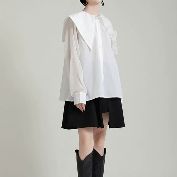 華やかなデザインが特徴の長袖シャツです。パフスリーブやフリル、透け感のある素材が女性らしさを引き立てます。ウエストに付いたベルトでシルエット調整が可能で、フロントのボタンで開閉もしやすい便利さも兼ね備えています。ルーズなシルエットがリラックス感を演出し、大人可愛いスタイリングにぴったりです。