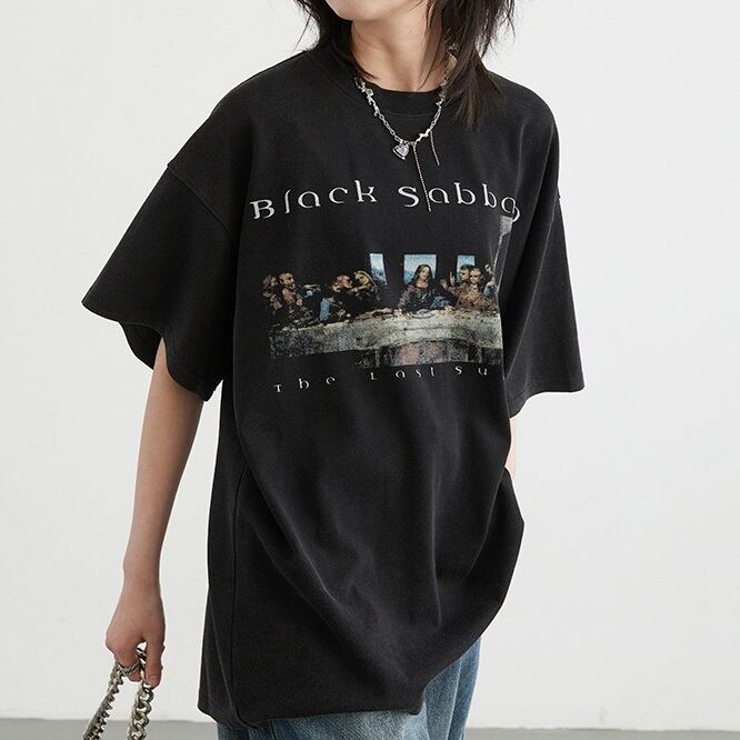 レディース トップス Tシャツ 丈長 半袖 ラウンドネック ワイド フェミニン かわいい カジュアル おしゃれ かっこいい レトロ こなれ感 ラフ メンズライク ルーズ 個性的 クール 存在感 学生風 ワイルド ロゴ アート プリント 春 通勤 学生 学校 通学 デート お出かけ アウトドア キャンプ 旅行 レストラン 公園 女子会 休日 ショッピング お花見 カフェ 重ね着 韓国 オルチャン 楽ちん 体型カバー 普段使い 着回し インスタ映え S M L ゆったり ゆる フリーサイズ 黒 ブラック
