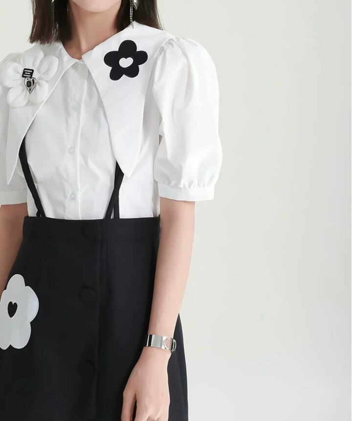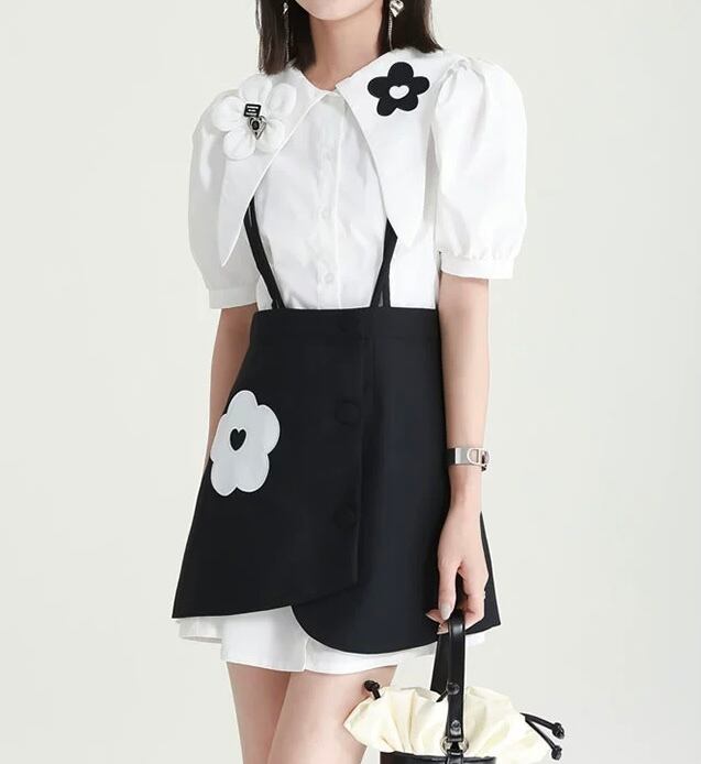 レディース セットアップ シャツ 半袖 襟付き 花 ボタン 前開き サスペンダースカート ショート丈 2点セット 上下セット スリム 細身 きれいめ 上品 おしゃれ お洒落 大人可愛い 大人女子 かっこいい シンプル フェミニン クール エレガント モダン レトロ 主役級 存在感 こなれ感 抜け感 夏 20代 30代 お出かけ デート 女子会 お泊まり 旅行 ショッピング 普段使い 韓国 オルチャン ファッション コーデ トレンド 流行 スタイル 脚長 美脚 インスタ映え S M L ホワイト ブラック