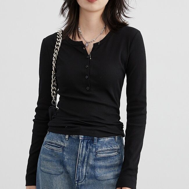 スリムなシルエットが女性らしさを引き立て、伸縮性のある素材が快適な着心地を提供します。ラウンドネックにボタンとギャザーのディテールが施され、さりげないアクセントを加えています。カジュアルからきれいめまで幅広いスタイリングにマッチし、オフィスやお出かけなど様々なシーンで活躍すること間違いなしです。