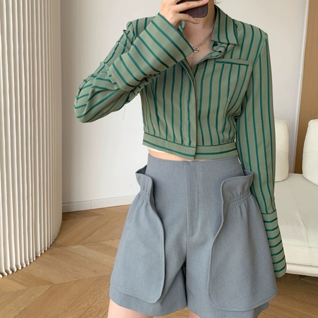 レディース トップス ジャケット シャツ シャツジャケット 上着 羽織 前開き Yシャツ ショート クロップド丈 長袖 襟付き ラペル ボタンダウン スリム 細身 ストレート ボタン 薄手 カジュアル 上品 おしゃれ かっこいい レトロ こなれ感 ルーズ 個性的 クール 主役級 存在感 簡単オシャレ ストライプ 春 夏 秋 授業参観 ママ デート お出かけ 公園 女子会 休日 ガーデン ショッピング カフェ 重ね着 韓国 コーデ スタイル 普段使い 着回し トレンド 流行 サイズ S M 緑 グリーン