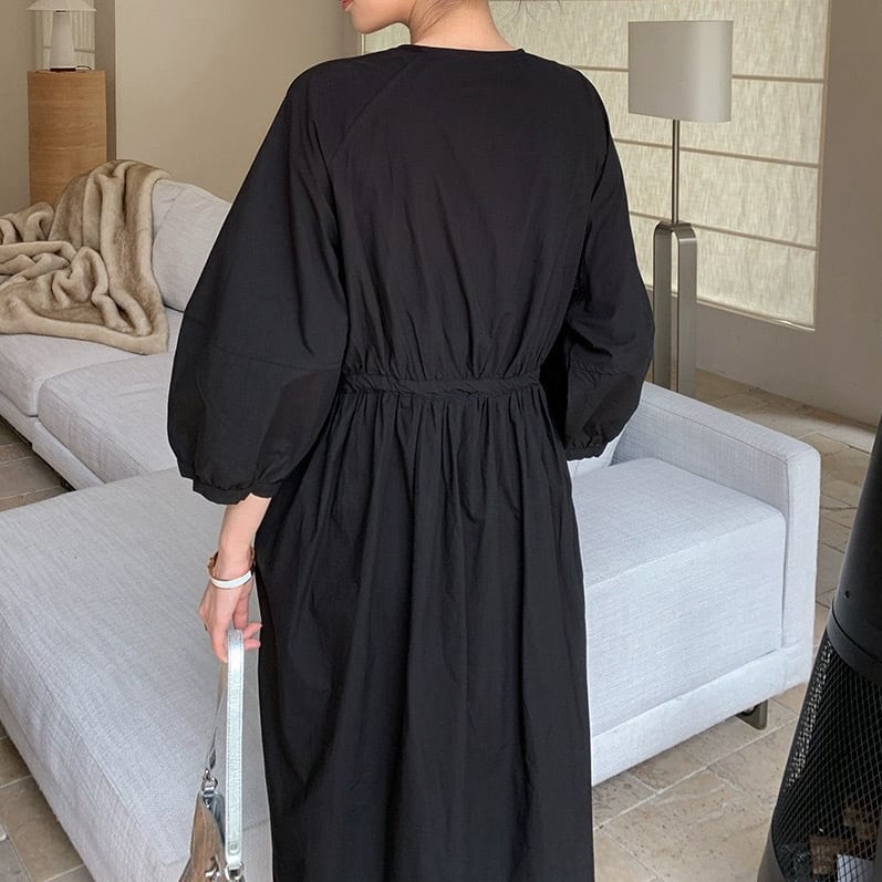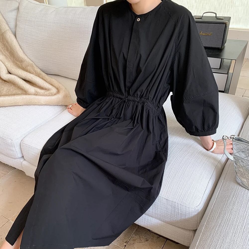 レディース ワンピース シャツ プルオーバー シャツワンピ ロングスカート ミモレ ロング 長袖 ボリューム袖 バルーン袖 ラウンドネック フレア Aライン ウエストマーク ウエストリボン ハイウエスト ギャザー シャーリング コットン シンプル カジュアル おしゃれ ラフ ルーズ ロマンティック ナチュラル 無地 春 夏 母の日 授業参観 ママ マタニティ デート お出かけ リゾート 旅行 海 ビーチ 公園 女子会 休日 ショッピング モノトーン 韓国 コーデ 楽ちん 普段使い S M 黒 ブラック