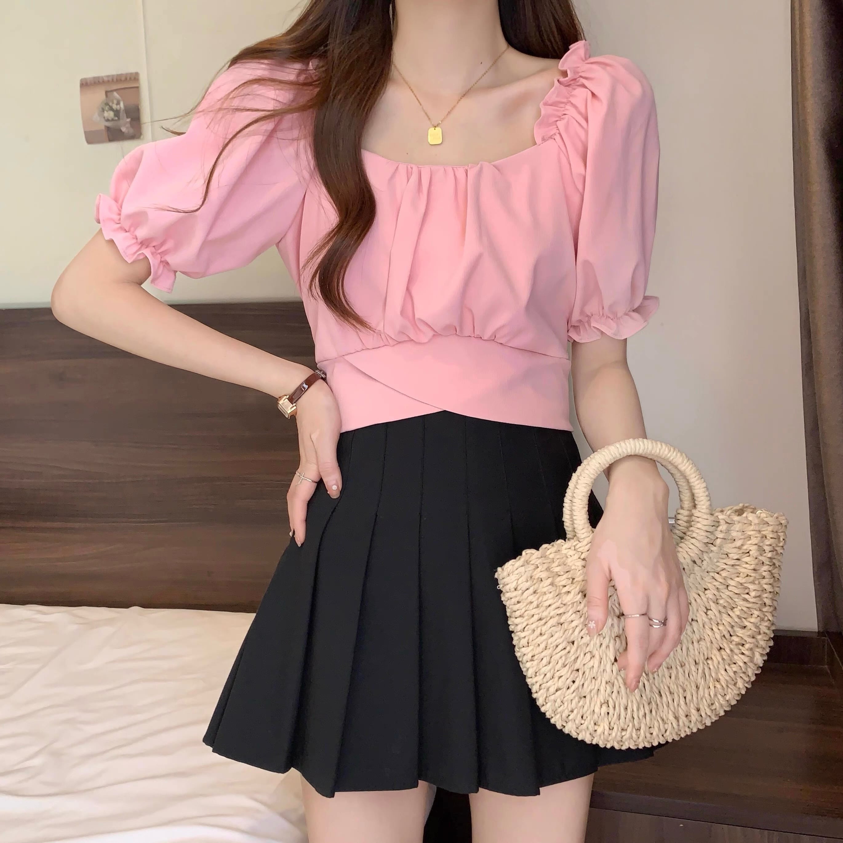 レディース トップス シャツ ブラウス プルオーバー ショート クロップド丈 半袖 パフスリーブ フリル袖 バルーン袖 スクエアネック スリム フェミニン フリル リボン ウエストマーク バックリボン バックコンシャス ハイウエスト かわいい 大人可愛い シンプル おしゃれ ガーリー ラブリー キュート プリンセス ロマンティック ドーリー 無地 春 夏 デート お出かけ 旅行 女子会 休日 ショッピング 韓国 コーデ 普段使い 着回し モテ S M L 白 ホワイト 黒 ブラック ピンク アプリコット