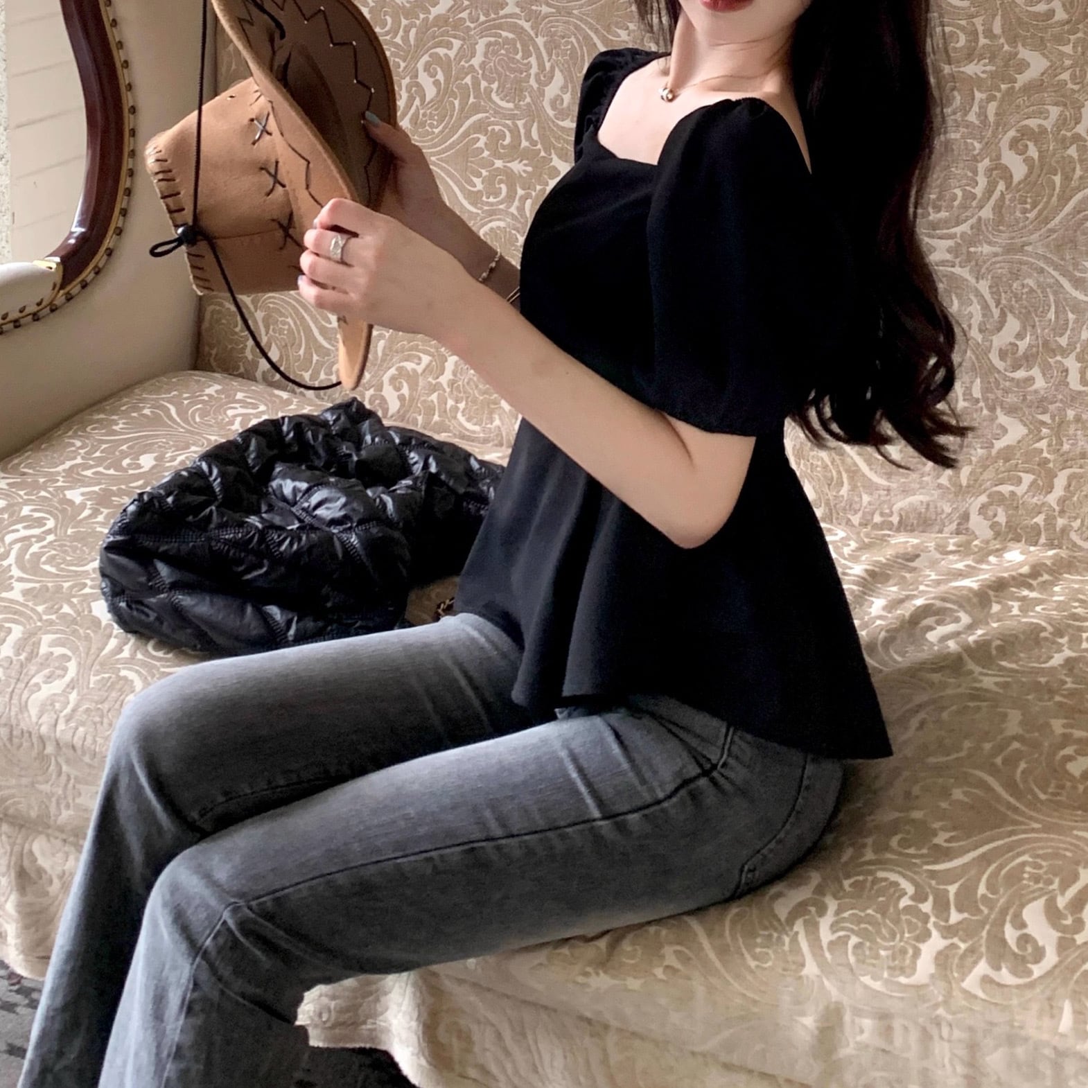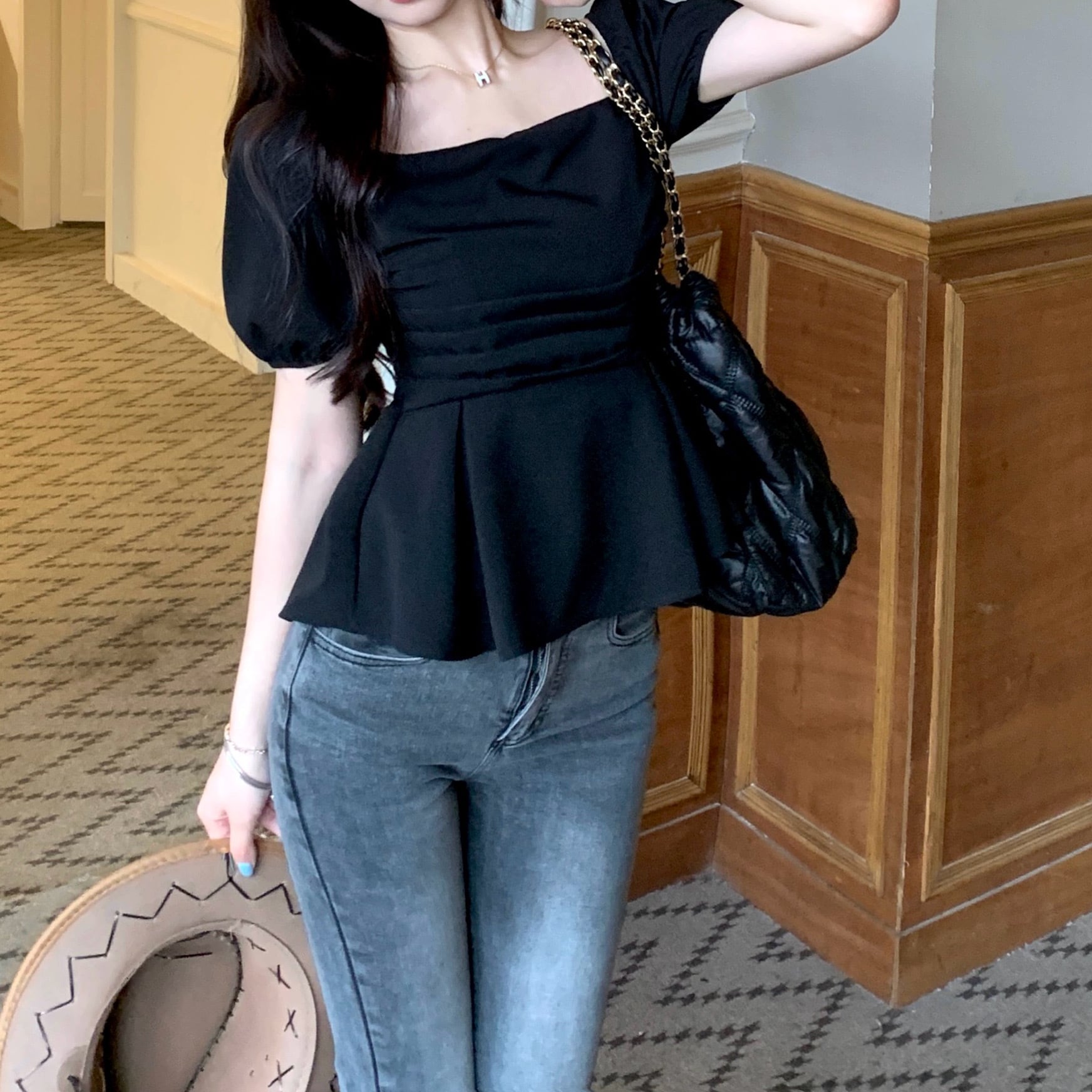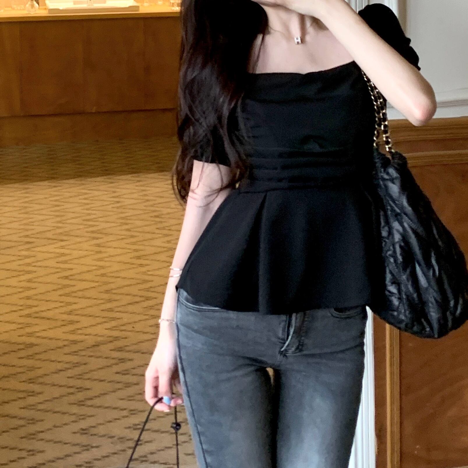 エレガントで女性らしい雰囲気を演出するペプラムスクエアネックシャツ。
