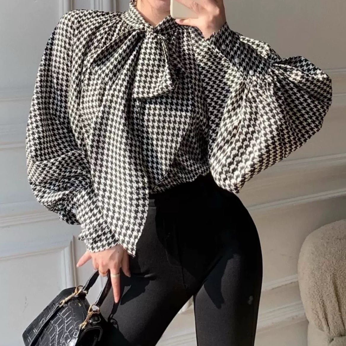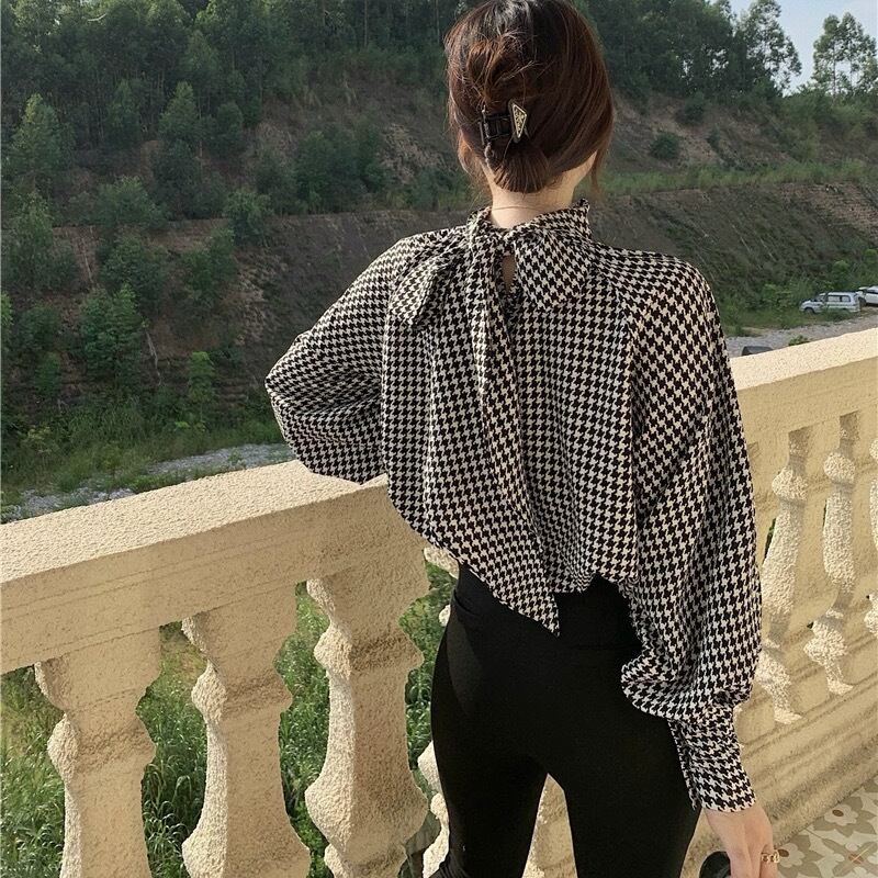 レトロでクラシカルな雰囲気漂う千鳥格子のボウタイブラウス。