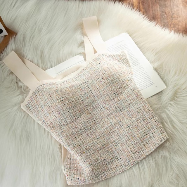 レディース トップス プルオーバー キャミソール インナー 袖なし ノースリーブ カップ付き スクエアネック タイト スリム 細身 Iライン フェミニン ツイード MIXツイード かわいい 大人可愛い きれいめ シンプル カジュアル 上品 おしゃれ ガーリー クール モード系 エレガント ラグジュアリー ロマンティック 無地 春 夏 秋 学生 デート お出かけ パーティー 公園 女子会 休日 ショッピング 韓国 オルチャン コーデ 普段使い 着回し モテ フリーサイズ カラー 黒 ブラック アプリコット