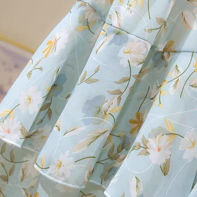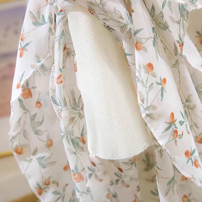小花柄のプリントが女性らしさを引き立て、三段に広がるフレアスカートは動くたびに揺れて可愛らしい印象を与えてくれます。