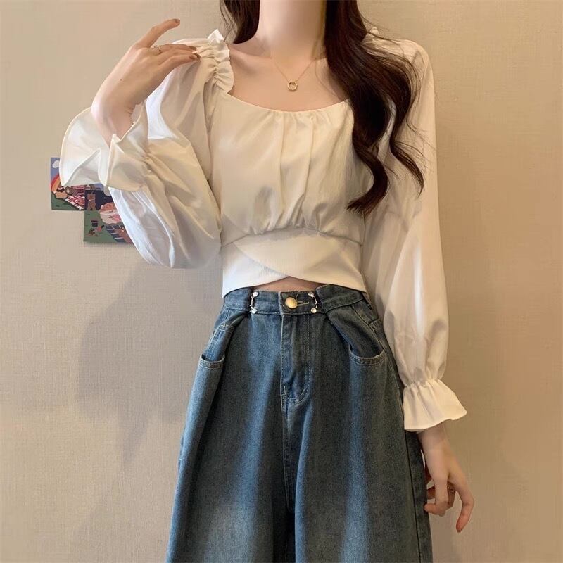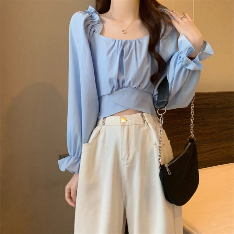 レディース トップス シャツ ブラウス プルオーバー ショート クロップド丈 長袖 パフスリーブ フリル袖 バルーン袖 スクエアネック スリム フェミニン フリル リボン ウエストマーク バックリボン バックコンシャス ハイウエスト かわいい 大人可愛い シンプル おしゃれ ガーリー ラブリー キュート プリンセス ロマンティック ドーリー 無地 春 夏 デート お出かけ 旅行 女子会 休日 ショッピング 韓国 スタイル 普段使い S M L 白 ホワイト 黒 ブラック ピンク アプリコット ブルー