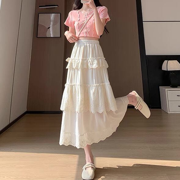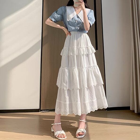 レディース スカート ボトムス フレア ティアード ギャザースカート フレアスカート ロングスカート レーススカート ミモレ ロング フレア Aライン フェミニン タックプリーツ レース 刺繍 フリル ハイウエスト ウエストゴム かわいい 大人可愛い おしゃれ レトロ ラフ ガーリー ラブリー キュート プリンセス ロマンティック フェアリー 無地 春 夏 学生 デート お出かけ 公園 女子会 休日 ショッピング 韓国 コーデ 楽ちん 普段使い 着回し モテ S M L XL 白 ホワイト アプリコット