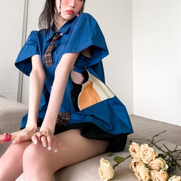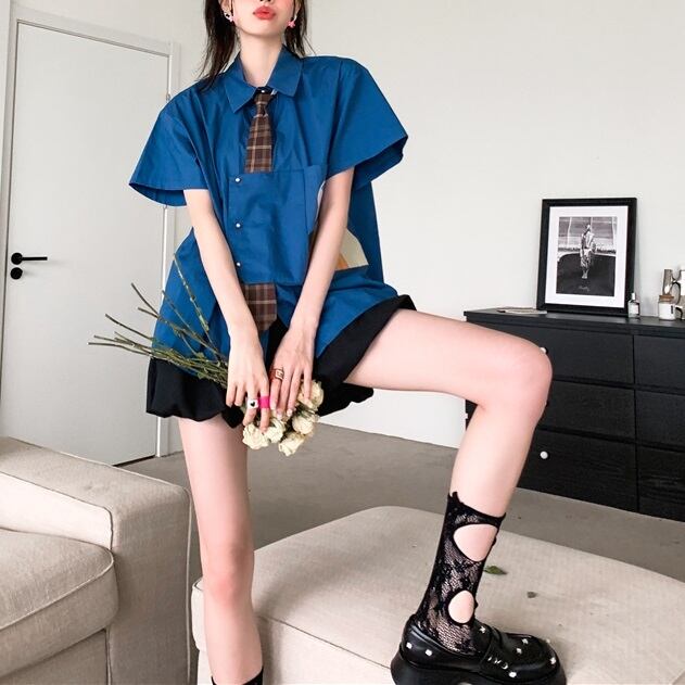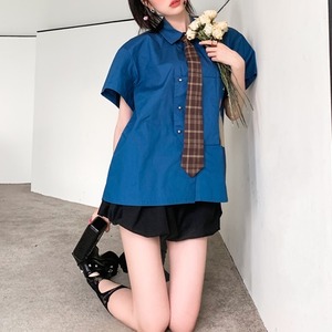 レディース トップス シャツ 半袖 ラウンドネック 襟付き ポロカラー ネクタイ ネクタイ付き アシンメトリー フェミニン ポケット ボタン アメカジ かわいい 大人可愛い カジュアル おしゃれ レトロ こなれ感 ラフ ボーイッシュ ルーズ 個性的 主役級 存在感 抜け感 都会的 クラシカル カレッジ風 学生風 アメリカン 無地 チェック 夏 学生 学校 通学 デート お出かけ アウトドア 旅行 レストラン 女子会 休日 ショッピング コンサート ライブ 重ね着 普段使い インスタ映え S M L ブルー