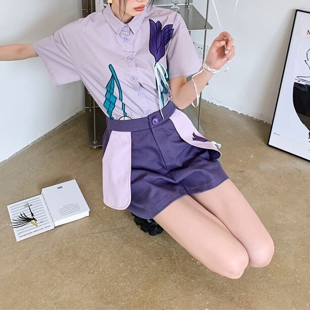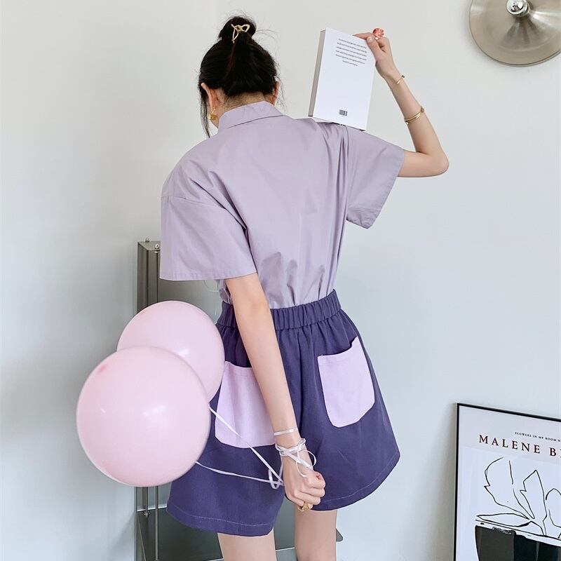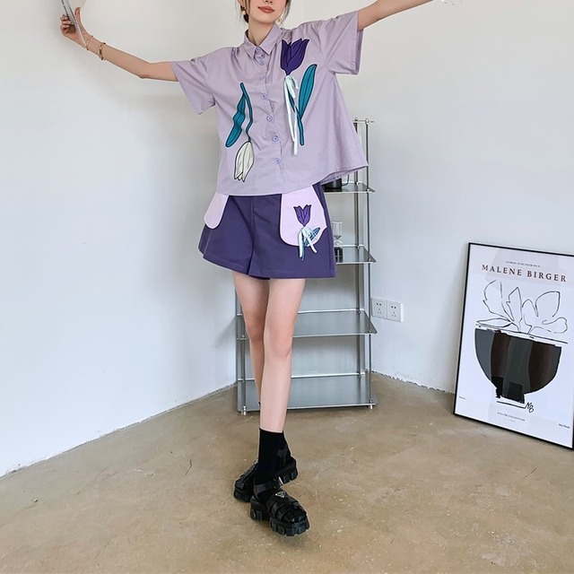レディース トップス パンツ ボトムス シャツ セットアップ ミニ ショート 膝上 半袖 ラウンドネック 襟付き ポロカラー フェミニン リボン 前開き かわいい 大人可愛い カジュアル おしゃれ レトロ こなれ感 ラフ ガーリー ルーズ 個性的 主役級 存在感 ラブリー キュート クラシカル 花柄 フラワー 夏 学生 学校 通学 デート お出かけ アウトドア 旅行 レストラン 女子会 休日 ショッピング コンサート ライブ 韓国 オルチャン 普段使い 着回し インスタ映え S M L パープル