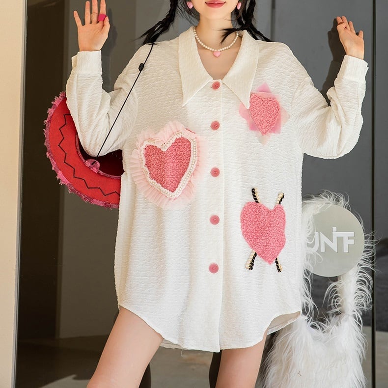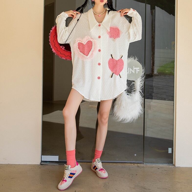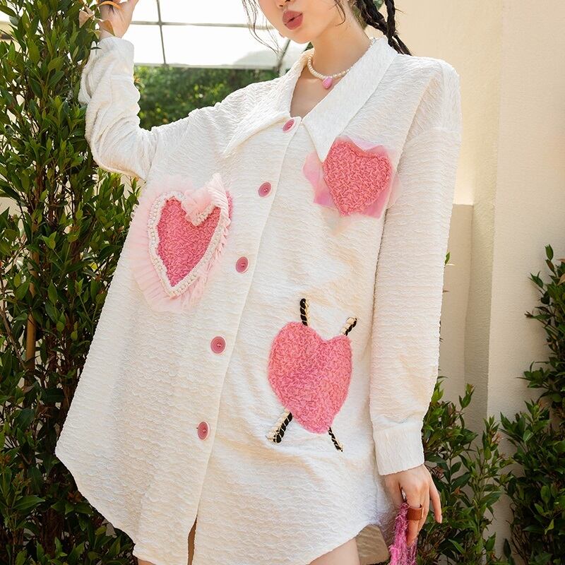 心を掴む可愛らしいハート柄が特徴のシャツワンピース。女性らしいシルエットを演出し、着るだけで華やかな雰囲気を作り出します。襟付きで上品さもプラスされ、様々なシーンで活躍してくれること間違いなし。春先から秋まで長く楽しめるアイテムです。