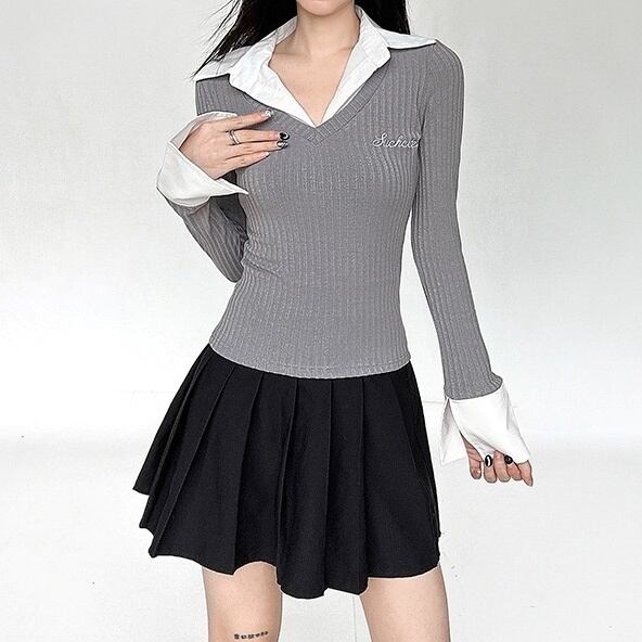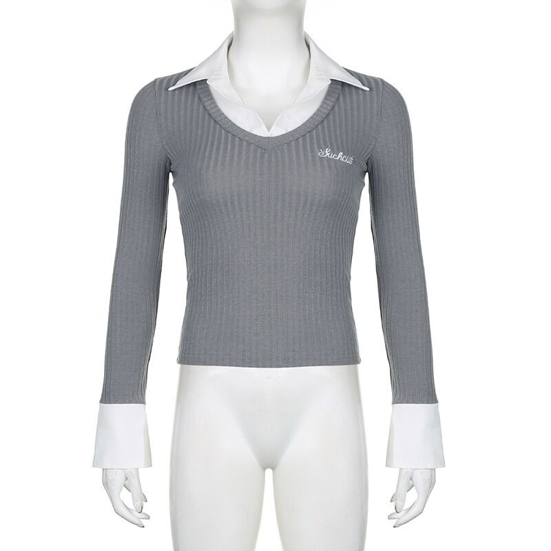 トップス シャツ 長袖 Vネック レディース 襟付き 角襟 タイト スリム 細身 ドッキング 異国風 切り替えデザイン ドッキング 異素材ミックス かわいい 大人可愛い きれいめ シンプル カジュアル 上品 おしゃれ かっこいい レトロ こなれ感 ラフ 個性的 クール 存在感 抜け感 カレッジ風 学生風 アメリカン ナチュラル 無地 春 夏 秋 ロングシーズン 学生 学校 通学 デート お出かけ 休日 ショッピング モノトーン 楽ちん 普段使い インスタ映え S M L 黒 ブラック グレー