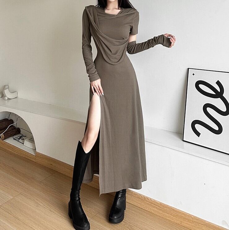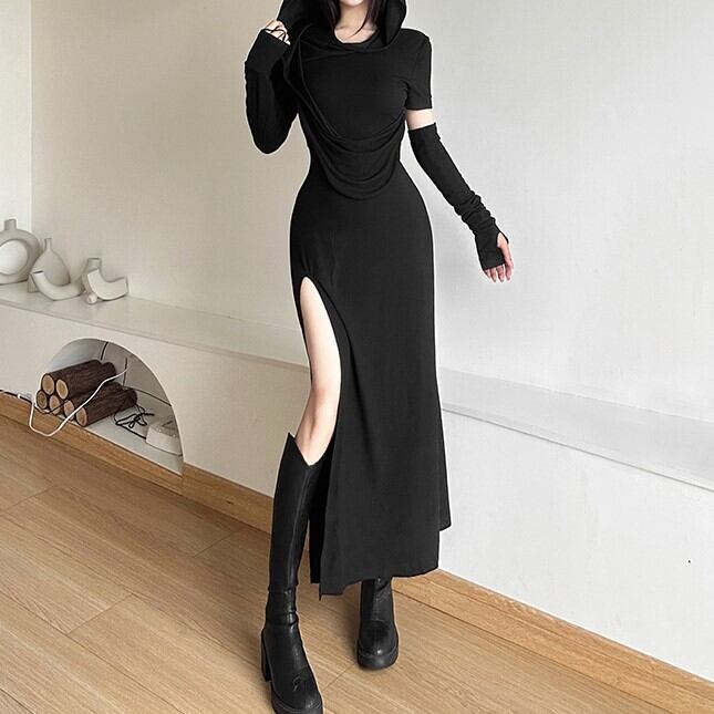 レディース ワンピース ロング 長袖 フード スリム スリット 大人可愛い きれいめ シンプル おしゃれ かっこいい ラフ クール フォーマル 都会的 ロマンティック ナチュラル 無地 秋 通勤 デート お出かけ お泊まり イベント 旅行 海 レストラン 公園 女子会 休日 ホテル ショッピング カフェ お揃い 韓国 コーデ 楽ちん プレゼント 美脚 普段使い 着回し モテ インスタ映え S M L ブラック カーキ