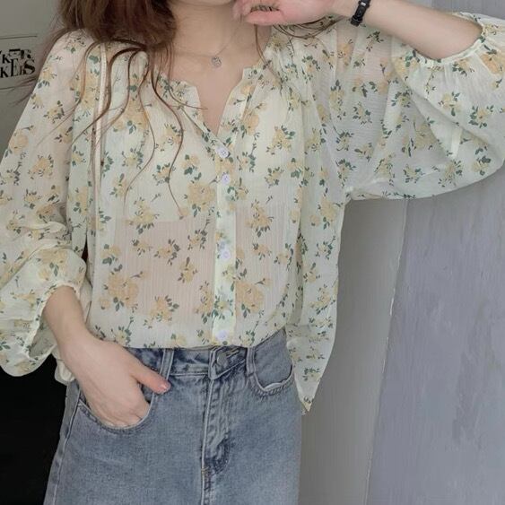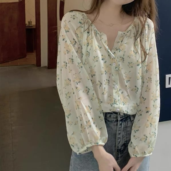 レディース トップス シャツ ブラウス シフォンシャツ 羽織 前開き 長袖 バルーン袖 プリーツパフ Vネック フェミニン シフォン 透け感 シースルー 薄手 かわいい 大人可愛い きれいめ シンプル カジュアル おしゃれ レトロ ラフ ガーリー ルーズ キュート 花柄 フラワー 春 夏 母の日 ママ 学生 学校 通学 デート お出かけ リゾート 旅行 公園 女子会 休日 ガーデン ショッピング カフェ 韓国 コーディネート スタイル 体型カバー 普段使い 着回し サイズ S M L イエロー 春カラー