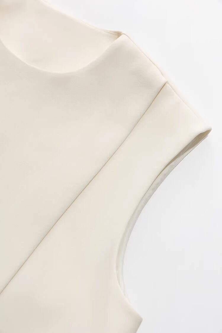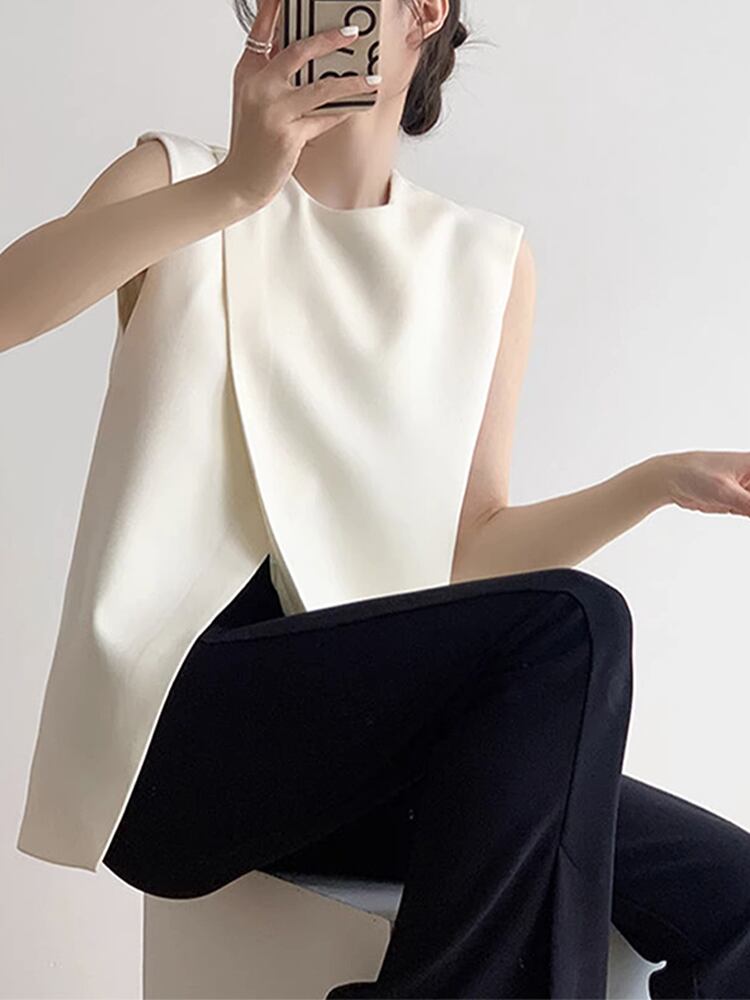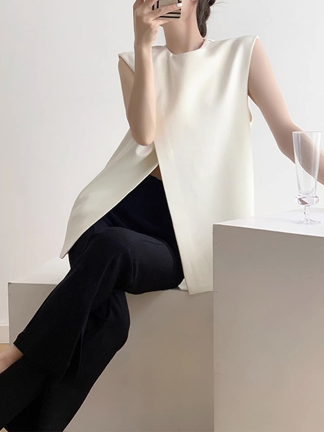 涼しげな印象を演出するノースリーブ アシンメトリー トップスが登場しました。レディース向けのプルオーバーで、丈長で袖もなし、ラウンドネックで襟もないシンプルなデザインが特徴です。大人可愛い雰囲気を演出しつつ、上品な印象も与える一枚は、おしゃれなカジュアルスタイルにぴったりです。モード系やエレガントな装いにもマッチし、春夏のファッションに爽やかな風を吹かせてくれることでしょう。