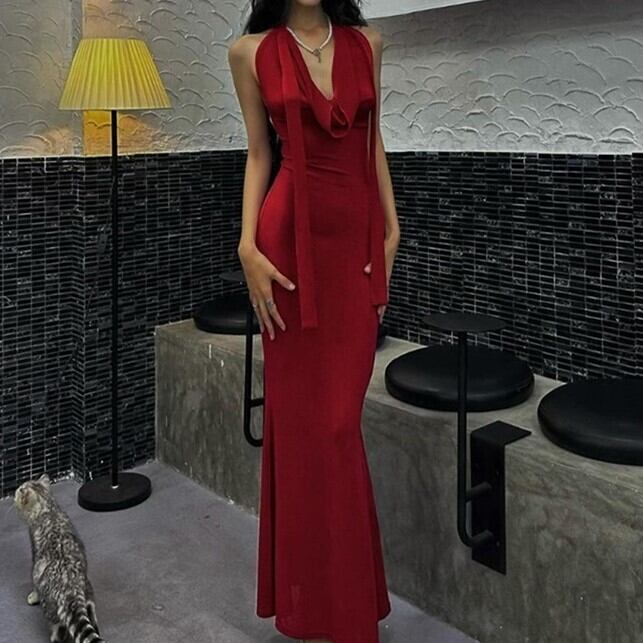 ドレス ワンピース ウェディング パーティー 結婚式 二次会 披露宴 演奏会 発表会 ステージ 舞台 フォーマル キャバ 衣装 演劇 ラウンジ クラブ ロング ノースリーブ Vネック ホルターネック きれいめ 大人可愛い 上品 おしゃれ かっこいい クール モード エレガント 主役級 存在感 ゴージャス セクシー 華やか 無地 リゾート 旅行 ホテル レストラン 韓国 美脚 女子会 春 夏 秋 冬 シーズンレス S M L レッド