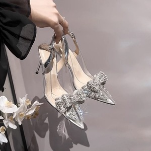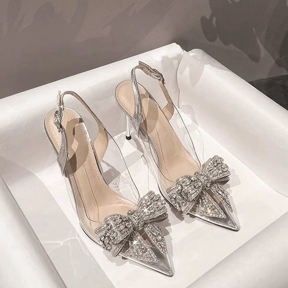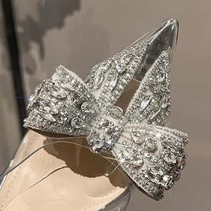 クリア素材とビジューのついた大きなリボンが印象的なハイヒールサンダル。