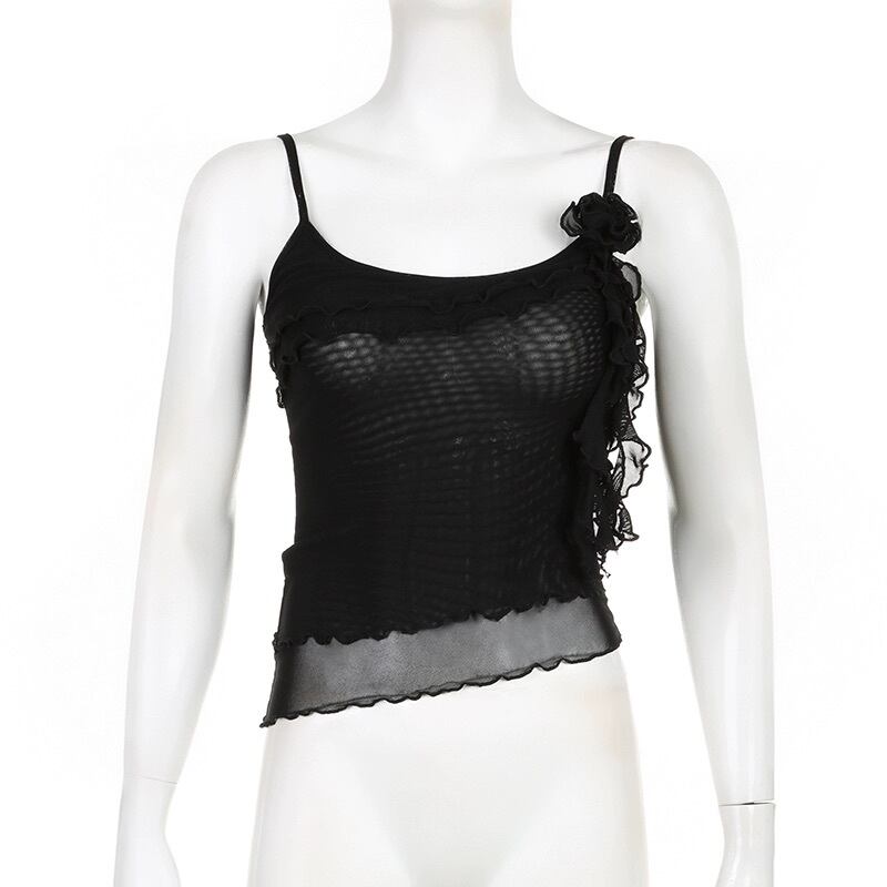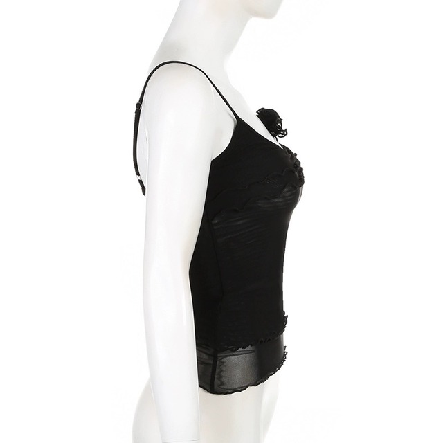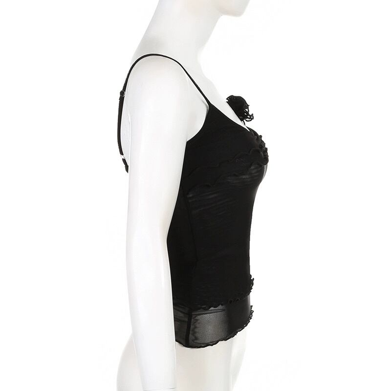 魅惑的なレースとフリルがアクセントの女性らしいキャミソール。ショート丈でノースリーブなので、夏のおしゃれコーディネートにぴったりです。ハイウエストでスリムなシルエットが作れるので、大人女子らしいスタイリングが楽しめます。