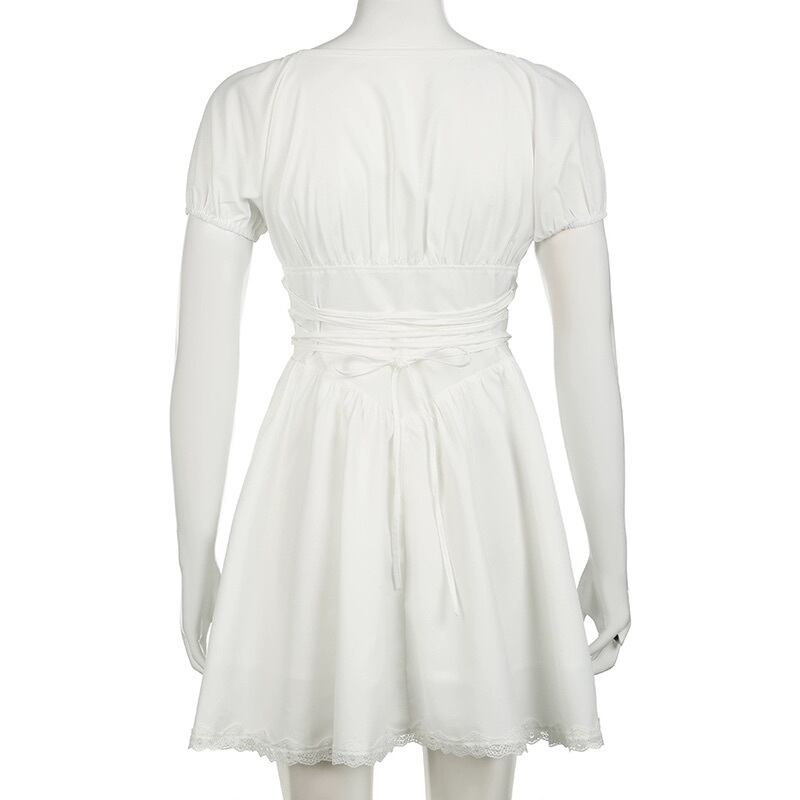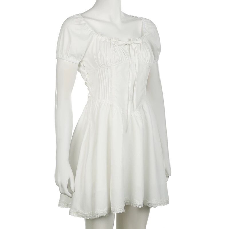 レディース ワンピース 膝丈 半袖 スクエアネック レース Aラインスカート プリーツ リボン ハイウエスト スリム 細身 きれいめ 上品 おしゃれ お洒落 シンプル 大人可愛い 大人女子 かっこいい セクシー クール モダン エレガント フェミニン レトロ 主役級 存在感 こなれ感 抜け感 夏 10代 20代 お出かけ デート 女子会 お泊まり レストラン 休日 普段使い デイリー 韓国 韓国系 オルチャン 美脚 脚長 ファッション コーデ トレンド 流行 スタイル インスタ映え S M L ホワイト