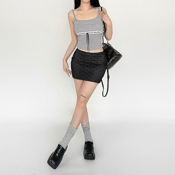 レディース スカート ショート丈 ミニスカート ドット柄 水玉 ハイウエスト タイト スリム 細身 きれいめ 上品 おしゃれ お洒落 シンプル 大人可愛い 大人女子 かっこいい セクシー クール モダン エレガント フェミニン レトロ 主役級 存在感 こなれ感 抜け感 夏 20代 30代 お出かけ デート 女子会 お泊まり 旅行 レストラン 休日 普段使い デイリー 韓国 韓国系 オルチャン 美脚 脚長 ファッション コーデ トレンド 流行 スタイル スタイルアップ インスタ映え S M L グレー