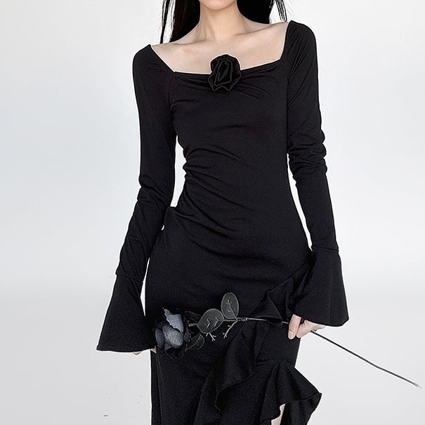 ワンピース ドレス ロング アシンメトリー レディース 丈長 長袖 ボリューム袖 スクエアネック 襟なし ノーカラー タイト スリム 細身 フェミニン 変形 フリル スリット サイドスリット ハイウエスト かわいい 大人可愛い きれいめ シンプル 上品 おしゃれ かっこいい エキゾチック こなれ感 個性的 クール エレガント 主役級 存在感 抜け感 ラグジュアリー クラシカル セクシー 無地 オールシーズン ロングシーズン シーズンレス デート お出かけ パーティー イベント S M L 黒 ブラック