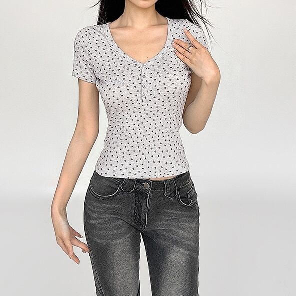 トップス シャツ ショート 半袖 レディース Vネック タイト スリム 細身 スマート フェミニン ハイウエスト ボタン 薄手 かわいい 大人可愛い きれいめ シンプル カジュアル おしゃれ かっこいい レトロ こなれ感 ラフ 個性的 クール 存在感 抜け感 ラブリー キュート ベーシック アメリカン ナチュラル ドット柄 水玉 デート お出かけ パーティー イベント リゾート 旅行 レストラン 公園 女子会 休日 バカンス ショッピング ライブ カフェ フェス 楽ちん 普段使い S M L グレー