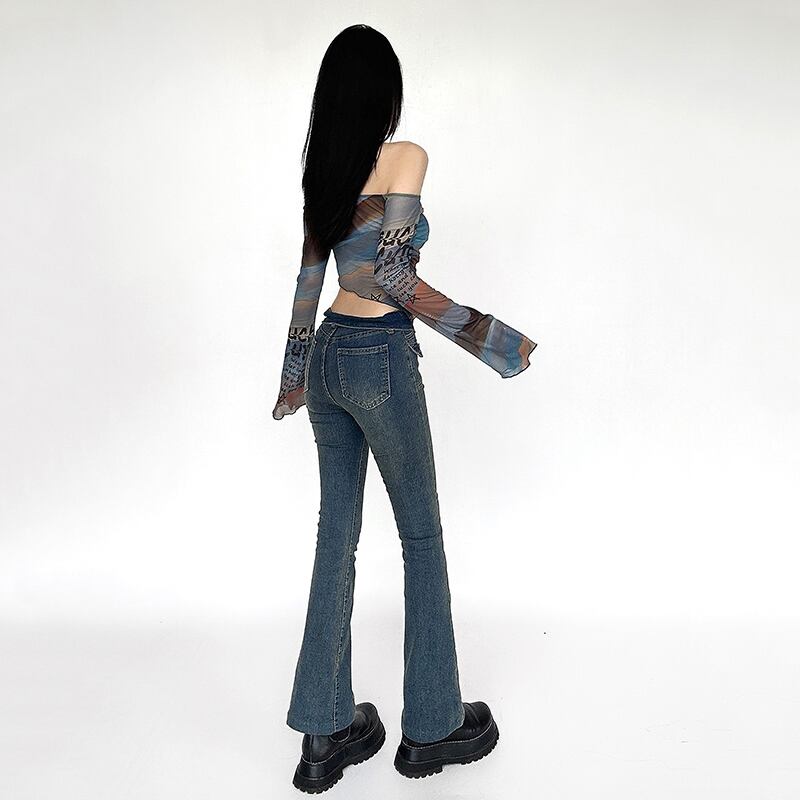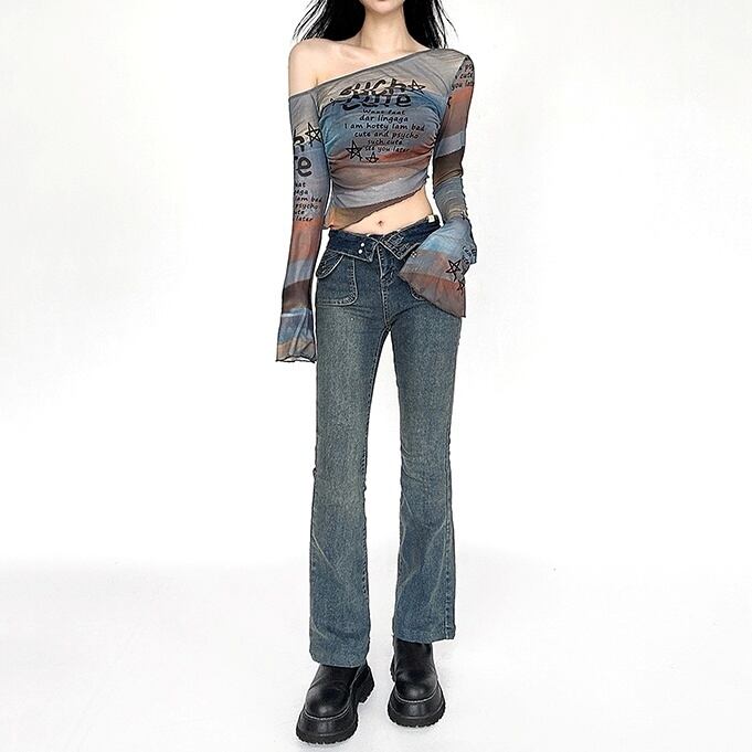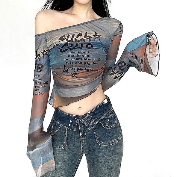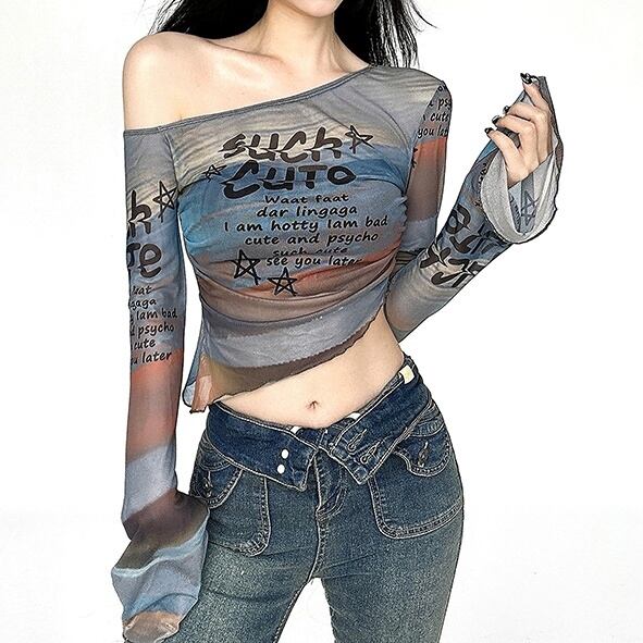 長袖のオフショルダーシャツで、ハイウエストデザインが女性らしさを引き立てます。