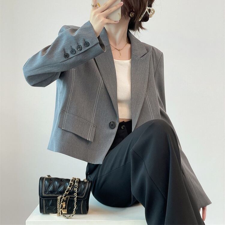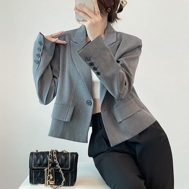 ジャケット アウター 上着 ショート 長袖 レディース トップス 襟付き ポケット ハイウエスト 前開き ボタン 大人可愛い きれいめ シンプル 上品 おしゃれ かっこいい こなれ感 クール モード系 エレガント 主役級 存在感 フォーマル かっちり キュート 都会的 ベーシック セクシー 無地 春 秋 入学式 入園式 卒業式 卒園式 授業参観 オフィス ビジネス OL 通勤 デート お出かけ イベント 女子会 休日 ショッピング 発表会 コンサート カフェ 韓国 普段使い 着回し S M L グレー