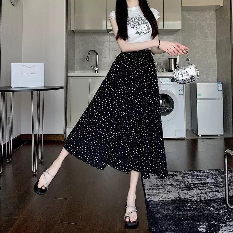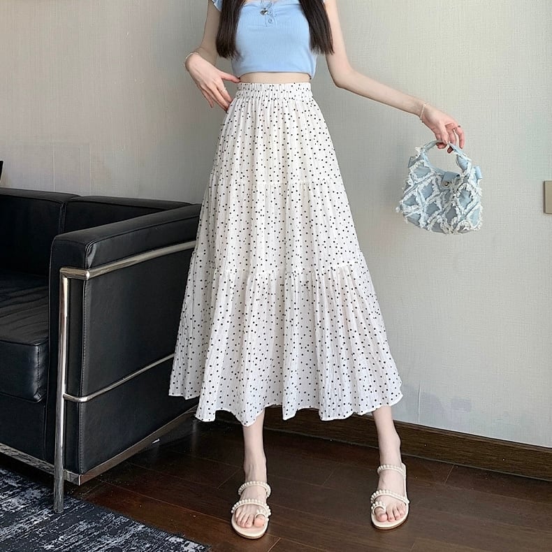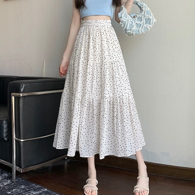 レディース スカート ミドル丈 ケーキスカート Aライン プリーツ ドット柄 水玉 ハイウエスト スリム 細身 きれいめ 上品 おしゃれ お洒落 シンプル 大人可愛い 大人女子 かっこいい クール モダン エレガント フェミニン レトロ 主役級 存在感 こなれ感 抜け感 夏 10代 20代 30代 40代 お出かけ デート 女子会 お泊まり 旅行 レストラン 普段使い デイリー 韓国 オルチャン 美脚 脚長 ファッション コーデ トレンド 流行 スタイル インスタ映え S M L XL ホワイト ブラック