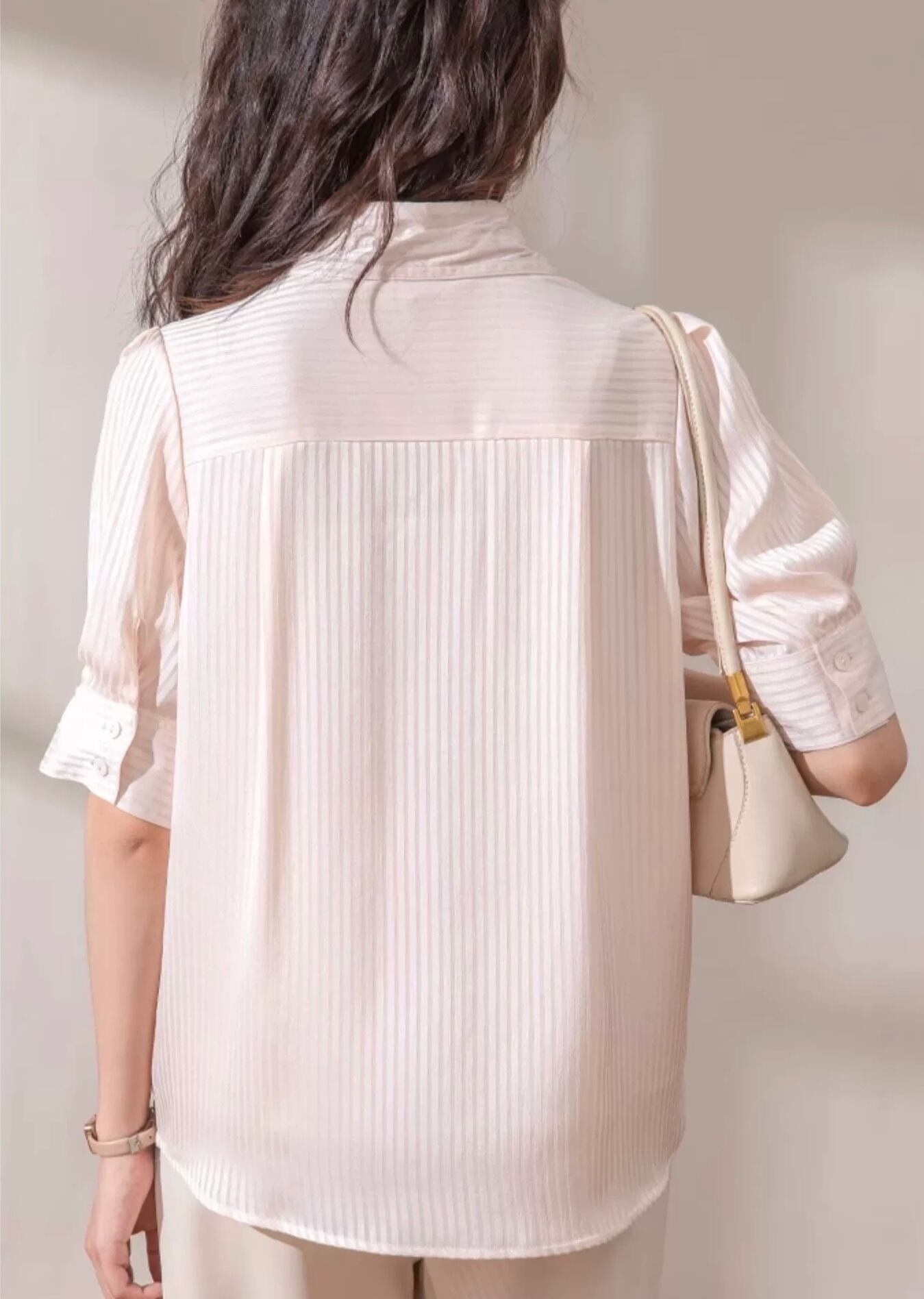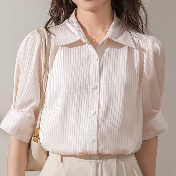 レディース シャツ トップス 半袖 パフスリーブ 襟付き ポロカラー ストライプ ボタン 前開き ルーズ きれいめ かわいい 可愛い 上品 おしゃれ お洒落 大人可愛い シンプル 大人女子 かっこいい フォーマル フェミニン レトロ 主役級 存在感 こなれ感 抜け感 夏 20代 30代 40代 OL 通勤 お出かけ オフィス デート 女子会 お泊まり ショッピング レストラン 韓国 韓国系 オルチャン ファッション コーデ トレンド 流行 スタイル インスタ映え S M L XL ホワイト アプリコット