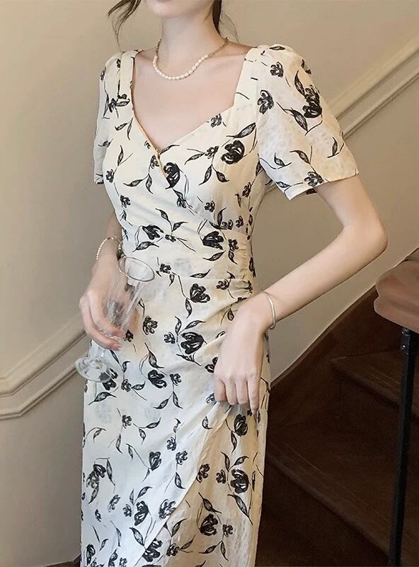 レディース ワンピース ミドル丈 半袖 ベルスリーブ スクエアネック スリット 花柄 Aライン ハイウエスト スリム 細身 きれいめ 上品 おしゃれ お洒落 シンプル 大人可愛い 大人女子 かっこいい クール モダン エレガント フェミニン レトロ 主役級 存在感 こなれ感 抜け感 夏 20代 30代 40代 お出かけ デート 女子会 旅行 レストラン ショッピング お泊まり 休日 普段使い 韓国 オルチャン 美脚 脚長 ファッション コーデ トレンド スタイル インスタ映え S M L XL ホワイト