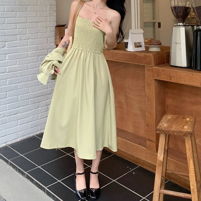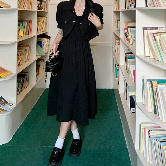 ジャケットはクロップド丈でこなれ感と脚長効果を演出し、キャミソールワンピースは胸下からの切り替えデザインが特徴です。