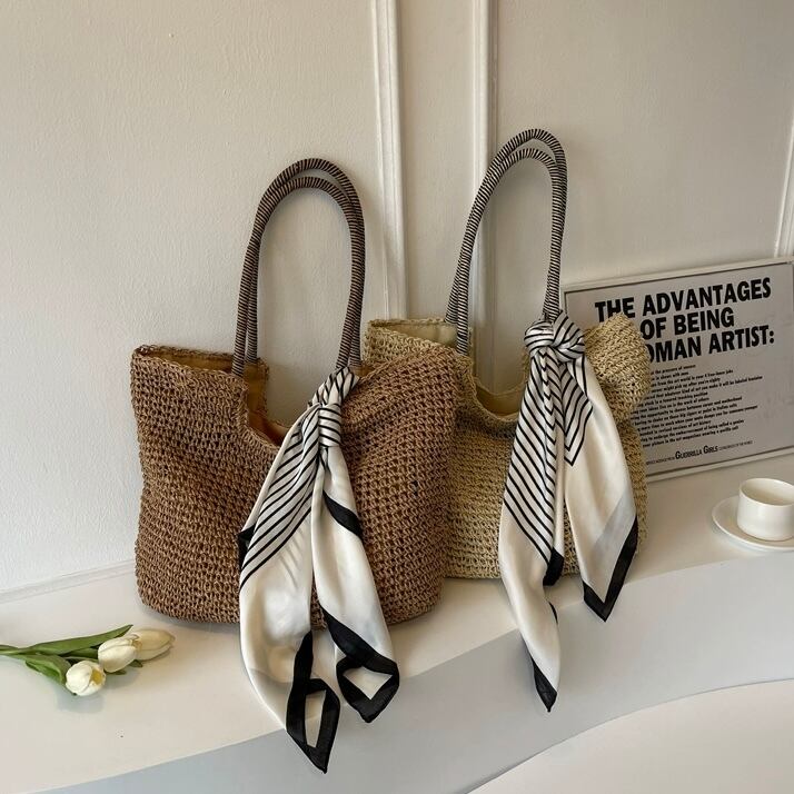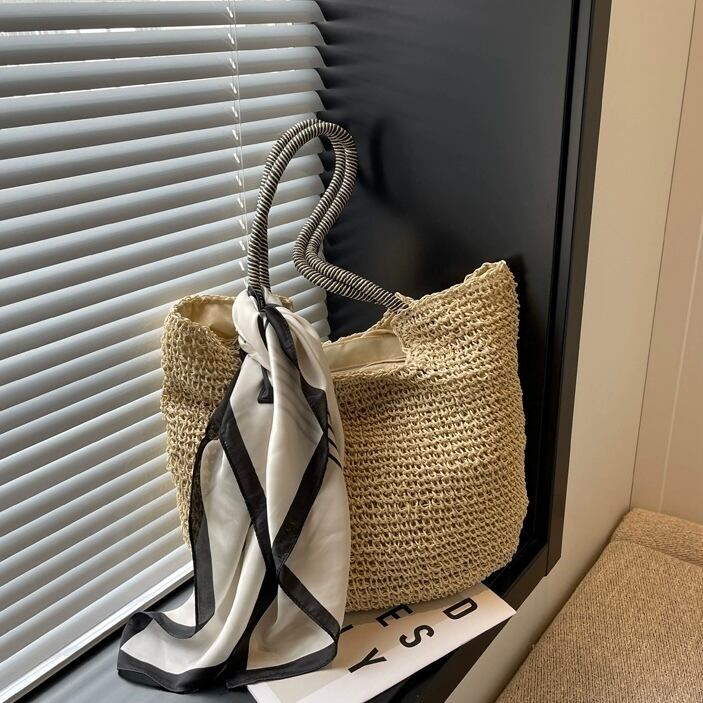 シンプルなデザインにスカーフが付属し、様々なスタイルに合わせやすいトートバッグです。ビーチやお出かけ、デートなど多彩なシーンで活躍します。大人可愛い雰囲気を演出したい方におすすめのアイテムです。荷物がたくさん入る大容量で機能的なのも嬉しいポイント。