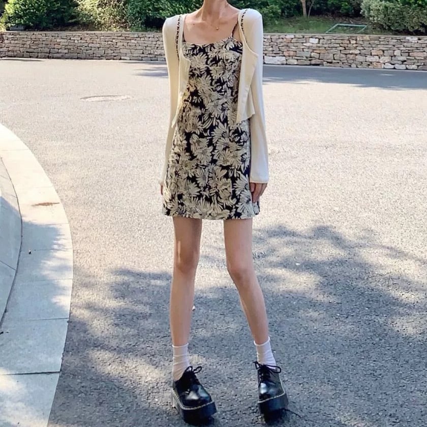 モノトーンのボタニカル柄のキャミソールワンピースと白カーディガンの2点セット。