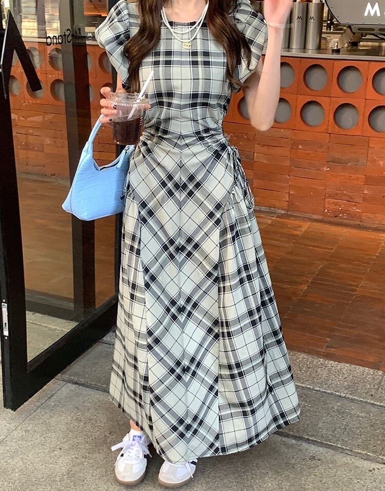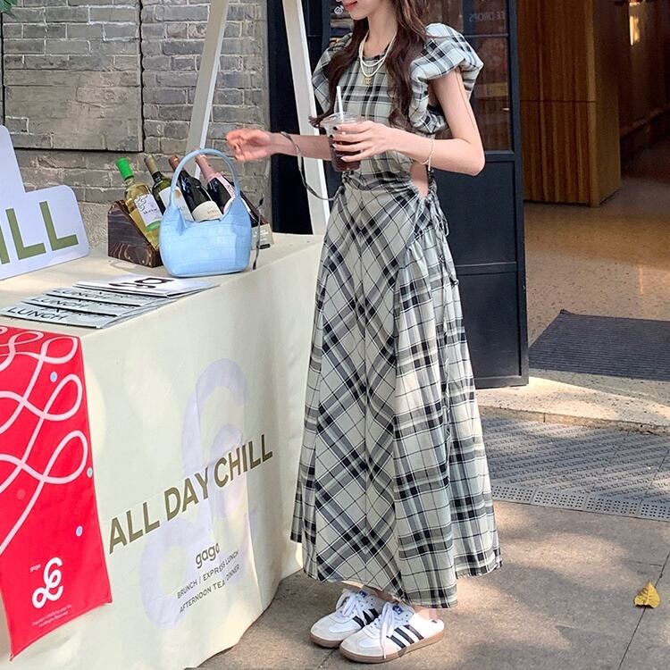 ワンピース ロング アンクル丈 レディース 丈長 半袖 ボリューム袖 パフスリーブ ラウンドネック 襟なし フレア フェミニン かわいい 大人可愛い きれいめ カジュアル おしゃれ こなれ感 ラフ ガーリー 主役級 存在感 ラブリー キュート ロマンティック ナチュラル チェック 格子柄 ロングシーズン デート お出かけ パーティー イベント リゾート 旅行 公園 女子会 休日 バカンス 高原 ガーデン ショッピング モノトーン 韓国 楽ちん 体型カバー 脚長 普段使い モテ S M L 白 ホワイト