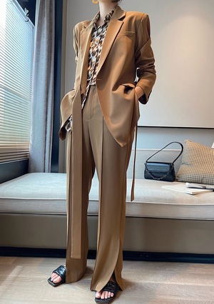 スーツ 上着 パンツ ボトムス レディース ロング 丈長 長袖 ウエストマーク ウエストリボン ポケット きれいめ シンプル おしゃれ かっこいい レトロ こなれ感 ラフ メンズライク 個性的 クール モード系 エレガント モダン 存在感 抜け感 かっちり クラシカル ワイルド セクシー 無地 オールシーズン ロングシーズン オフィス ビジネス お出かけ パーティー イベント 旅行 レストラン 休日 バカンス ショッピング 楽ちん 体型カバー 脚長 普段使い S M L ゆったり ゆる 茶色 ブラウン