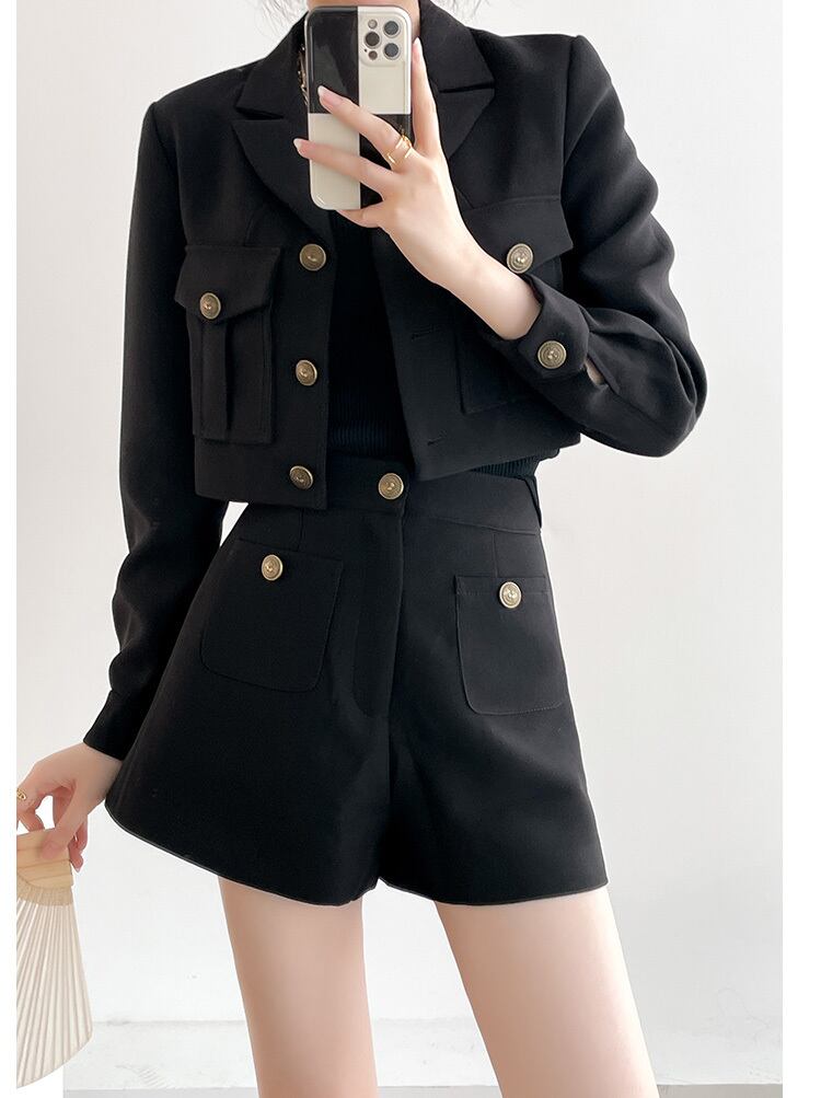 ショート丈のジャケットとミニ丈のパンツがおしゃれな印象を演出し、襟付きデザインが上品さを引き立てます。