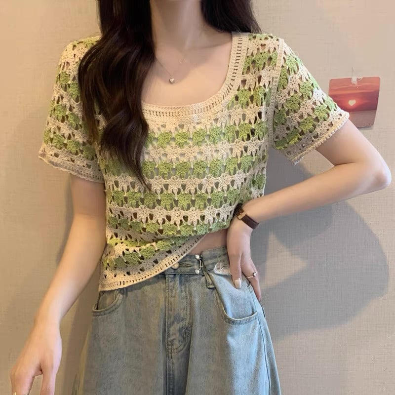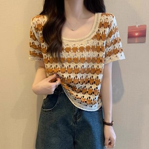 レディース トップス ニット プルオーバー Tシャツ ショート 半袖 スクエアネック スリム 細身 フェミニン クロシェ 伸縮性 かぎ針編み かわいい 大人可愛い シンプル カジュアル おしゃれ レトロ こなれ感 ラフ ガーリー 抜け感 キュート 学生風 花柄 フラワー 春 夏 母の日 授業参観 ママ 学生 デート お出かけ リゾート 旅行 海 ビーチ 公園 女子会 休日 ガーデン ショッピング カフェ 重ね着 韓国 オルチャン 普段使い 着回し レイヤード S M L 黒 ブラック オレンジ グリーン
