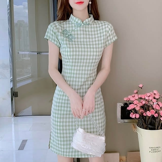 レディース ワンピース チャイナドレス 半袖 ショート丈 スタンドカラー チェック柄 プルオーバー ハイウエスト スリム 細身 きれいめ 上品 おしゃれ お洒落 大人可愛い 大人女子 カジュアル かっこいい スタイリッシュ エレガント クール モダン フェミニン レトロ 主役級 存在感 こなれ感 抜け感 夏 10代 20代 30代 お出かけ デート 女子会 旅行 お泊まり ショッピング 休日 普段使い 韓国 オルチャン ファッション コーデ トレンド スタイル 脚長 S M L XL 2XL グリーン
