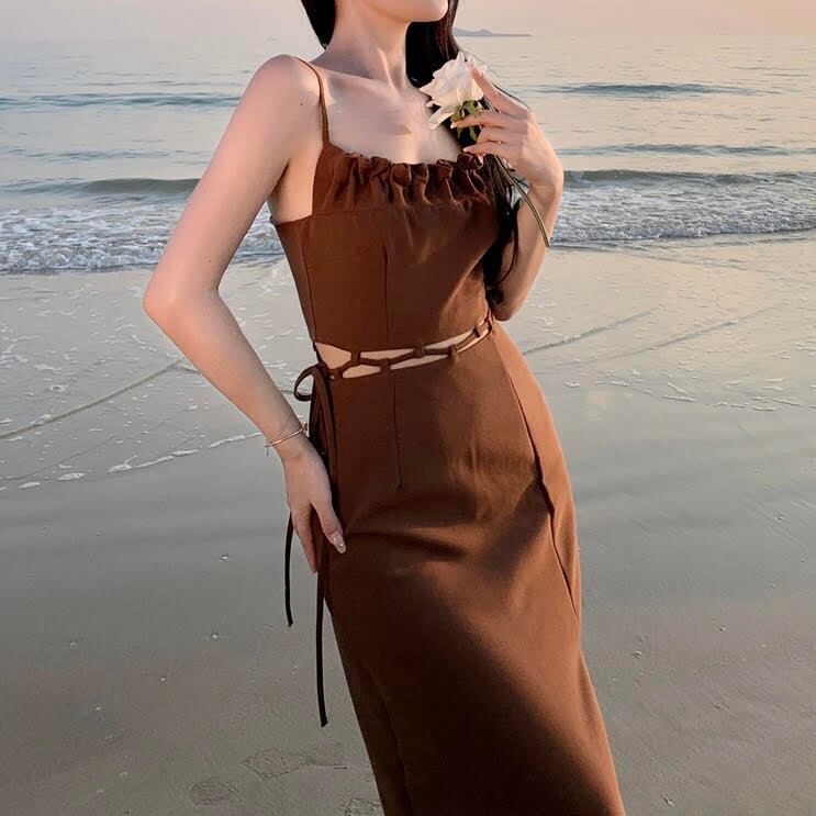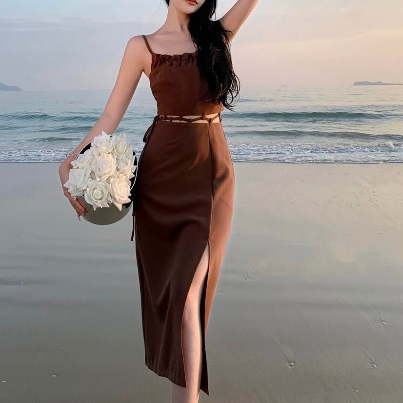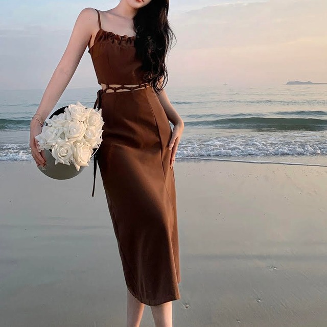 レディース ワンピース ノースリーブ ミモレ丈 サスペンダー バックレス サイドスリット リボン プルオーバー 無地 スリム 細身 きれいめ 上品 おしゃれ お洒落 大人可愛い 大人女子 かっこいい スタイリッシュ セクシー エレガント クール モダン フェミニン レトロ 主役級 存在感 こなれ感 抜け感 夏 20代 30代 40代 お出かけ デート 女子会 旅行 お泊まり リゾート ショッピング 休日 普段使い 韓国系 オルチャン ファッション コーデ トレンド スタイル 脚長 ワンサイズ ブラウン